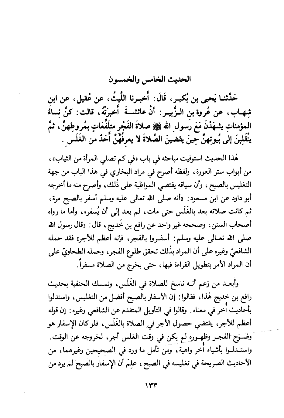 وأبعد من زعم أنه ناسخ للصلاة في الغَلَس، وتمسك الحنفية بحديث رافع بن خديج هذا، فقالوا: إن الأسفار بالصبح أفضل من التغليس، واستدلوا بأحاديث أُخر في معناه. وقالوا في التأويل المتقدم عن الشافعي وغيره: إن قوله أعظم للأجر، يقتضي حصول الأجر في الصلاة بالغَلَس، فلو كان الإسفار هو وضوح الفجر وظهوره لم يكن في وقت الغلس أجر، لخروجه عن الوقت. واستدلوا بأشياء أُخر واهية، ومن تأمل ما ورد في الصحيحين وغيرهما، من الأحاديث الصريحة في تغليسه في الصبح، علِمَ أن الإسفار بالصبح لم يرد من