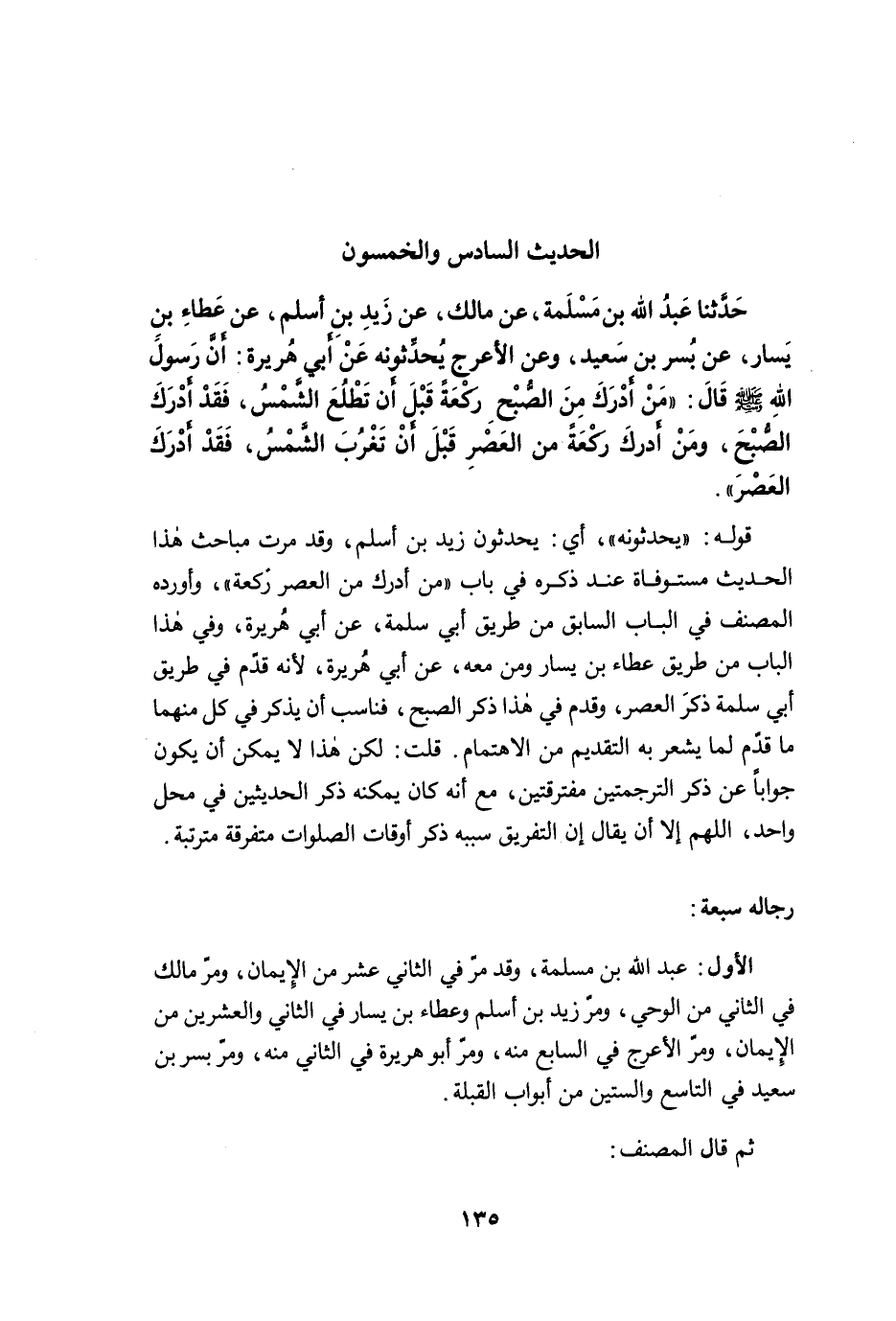 الأول: عبد الله بن مسلمة، وقد مرّ في الثاني عشر من الإيمان، ومرّ مالك في الثاني من الوحى، ومرّ زيد بن أسلم وعطاء بن يسار في الثاني والعشرين من الإيمان، ومرّ الأعرج في السابع منه، ومرّ أبو هريرة في الثاني منه، ومرّ بسر بن سعيد في التاسع والستين من أبواب القبلة.