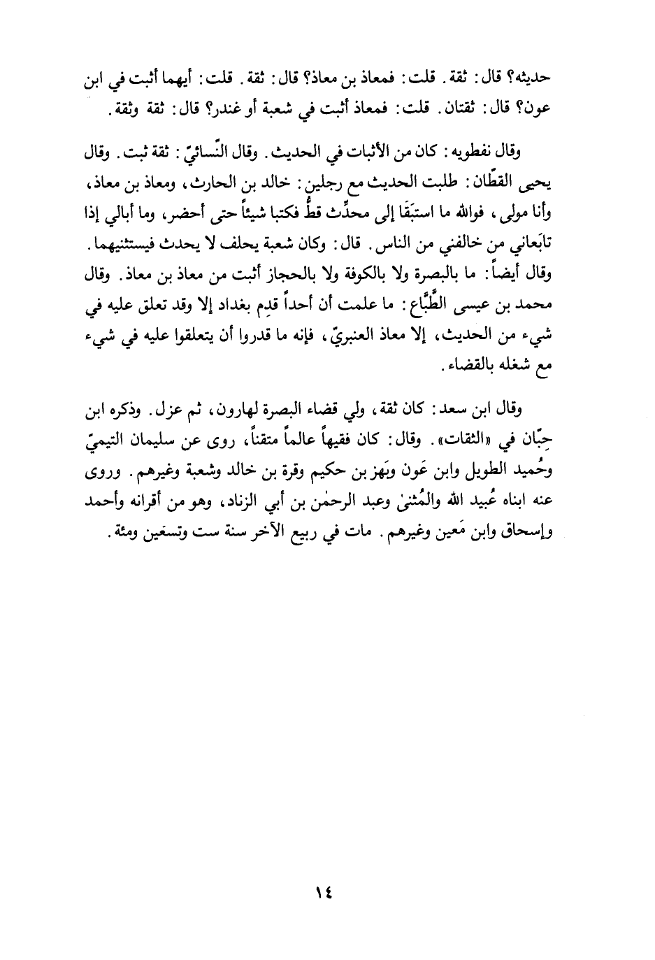 حديثه؟ قال: ثقة. قلت: فمعاذ بن معاذ؟ قال: ثقة. قلت: أيهما أثبت في ابن عون؟ قال: ثقتان. قلت: فمعاذ أثبت في شعبة أو غندر؟ قال: ثقة وثقة.