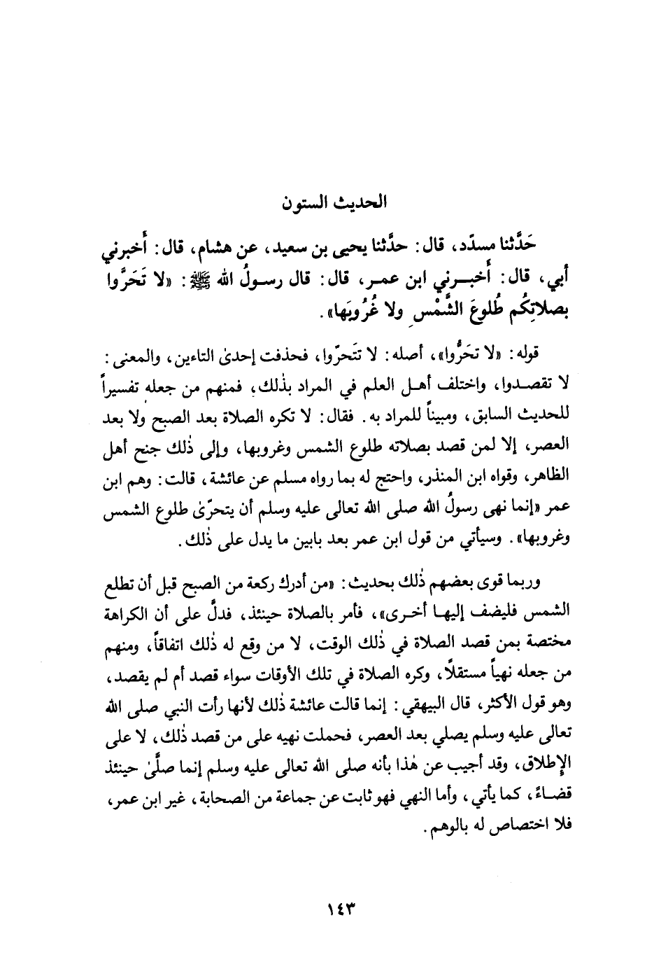 حَدَّثَنَا مُسَدَّدٌ، قَالَ: حَدَّثَنَا يَحْيَى بْنُ سَعِيدٍ، عَنْ هِشَامٍ، قَالَ: أَخْبَرَنِي أَبِي، قَالَ: أَخْبَرَنِي ابْنُ عُمَرَ، قَالَ: قَالَ رَسُولُ اللَّهِ -صلى الله عليه وسلم-: "لاَ تَحَرَّوْا بِصَلاَتِكُمْ طُلُوعَ الشَّمْسِ وَلاَ غُرُوبَهَا".