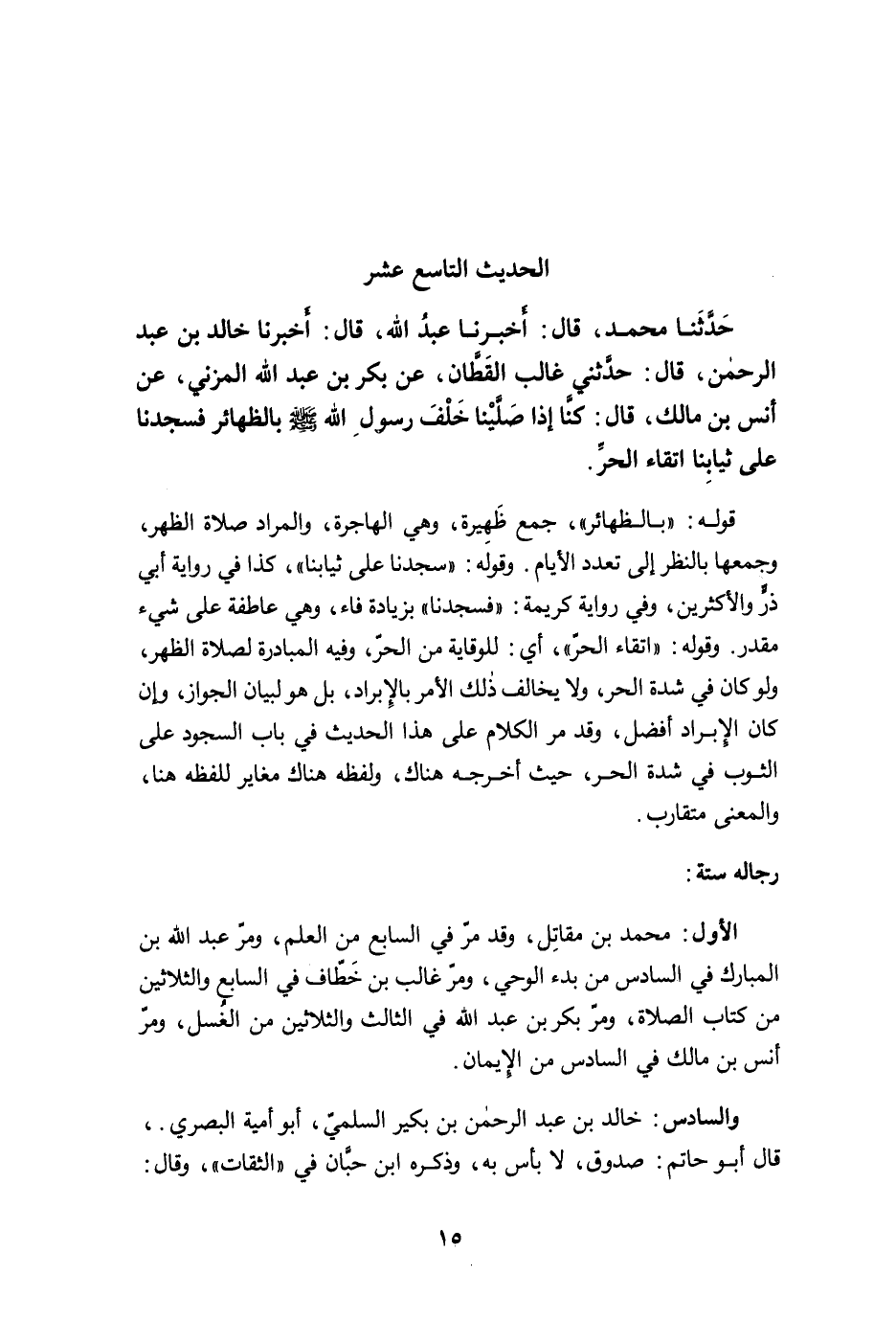 حَدَّثَنَا مُحَمَّدٌ، قَالَ: أَخْبَرَنَا عَبْدُ اللَّهِ، قَالَ: أَخْبَرَنَا خَالِدُ بْنُ عَبْدِ الرَّحْمَنِ، قَالَ: حَدَّثَنِي غَالِبٌ الْقَطَّانُ، عَنْ بَكْرِ بْنِ عَبْدِ اللَّهِ الْمُزَنِيِّ، عَنْ أَنَسِ بْنِ مَالِكٍ، قَالَ: كُنَّا إِذَا صَلَّيْنَا خَلْفَ رَسُولِ اللَّهِ -صلى الله عليه وسلم- بِالظَّهَائِرِ فَسَجَدْنَا عَلَى ثِيَابِنَا اتِّقَاءَ الْحَرِّ.