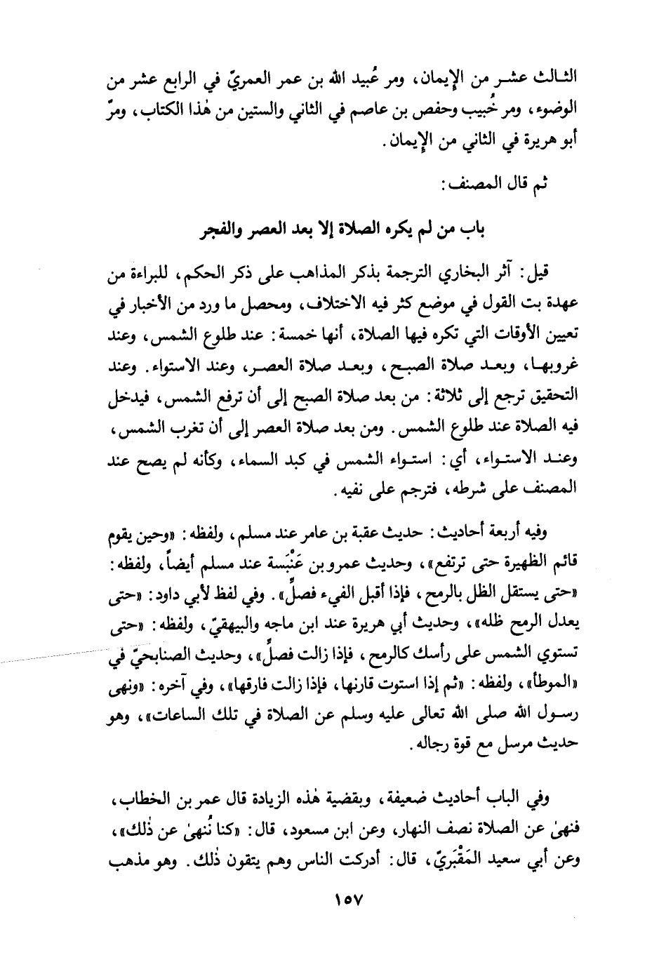 وفيه أربعة أحاديث: حديث عقبة بن عامر عند مسلم، ولفظه: "وحين يقوم قائم الظهيرة حتى ترتفع"، وحديث عمرو بن عَنْبَسة عند مسلم أيضًا، ولفظه: "حتى يستقل الظل بالرمح، فإذا أقبل الفيء فصلِّ". وفي لفظ لأبي داود: "حتى يعدل الرمح ظله"، وحديث أبب هريرة عند ابن ماجه والبيهقيّ، ولفظه: "حتى تستوي الشمس على رأسك كالرمح، فإذا زالت فصلِّ"، وحديث الصنابحيّ في "الموطأ"، ولفظه: "ثم إذا استوت قارنها، فإذا زالت فارقها"، وفي آخره: "ونهى رسول الله صلى الله تعالى عليه وسلم عن الصلاة في تلك الساعات"، وهو حديث مرسل مع قوة رجاله.