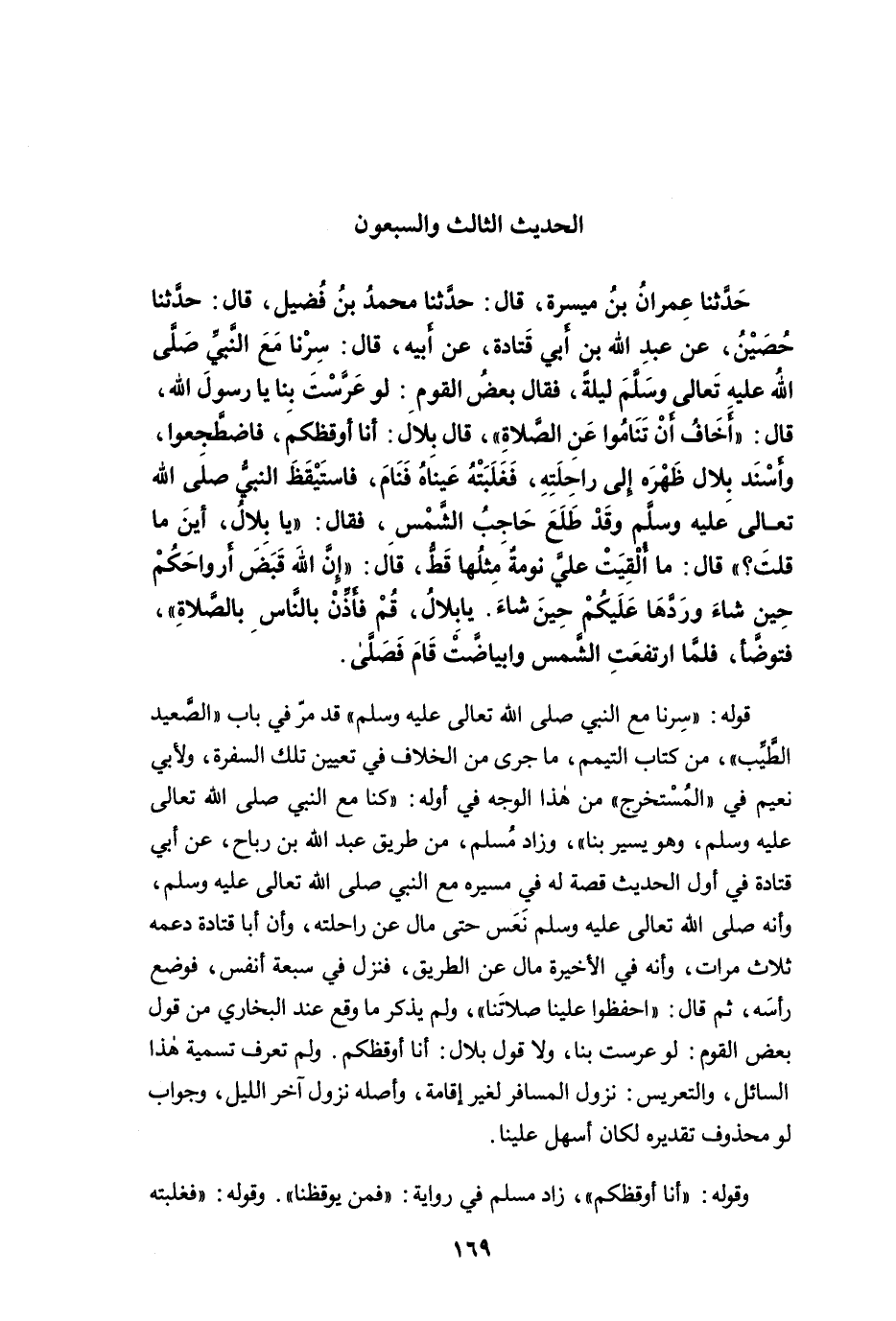 حَدَّثَنَا عِمْرَانُ بْنُ مَيْسَرَةَ، قَالَ: حَدَّثَنَا مُحَمَّدُ بْنُ فُضَيْلٍ، قَالَ: حَدَّثَنَا حُصَيْنٌ، عَنْ عَبْدِ اللَّهِ بْنِ أَبِي قَتَادَةَ، عَنْ أَبِيهِ، قَالَ: سِرْنَا مَعَ النَّبِيِّ -صلى الله عليه وسلم- لَيْلَةً، فَقَالَ بَعْضُ الْقَوْمِ: لَوْ عَرَّسْتَ بِنَا يَا رَسُولَ اللَّهِ. قَالَ: "أَخَافُ أَنْ تَنَامُوا عَنِ الصَّلاَةِ". قَالَ بِلاَلٌ: أَنَا أُوقِظُكُمْ، فَاضْطَجَعُوا، وَأَسْنَدَ بِلاَلٌ ظَهْرَهُ إِلَى رَاحِلَتِهِ، فَغَلَبَتْهُ عَيْنَاهُ فَنَامَ، فَاسْتَيْقَظَ النَّبِيُّ -صلى الله عليه وسلم- وَقَدْ طَلَعَ حَاجِبُ الشَّمْسِ، فَقَالَ: "يَا بِلاَلُ، أَيْنَ مَا قُلْتَ؟ ". قَالَ: مَا أُلْقِيَتْ عَلَيَّ نَوْمَةٌ مِثْلُهَا قَطُّ. قَالَ: "إِنَّ اللَّهَ قَبَضَ أَرْوَاحَكُمْ حِينَ شَاءَ، وَرَدَّهَا عَلَيْكُمْ حِينَ شَاءَ، يَا بِلاَلُ، قُمْ فَأَذِّنْ بِالنَّاسِ بِالصَّلاَةِ". فَتَوَضَّأَ فَلَمَّا ارْتَفَعَتِ الشَّمْسُ وَابْيَاضَّتْ قَامَ فَصَلَّى.
