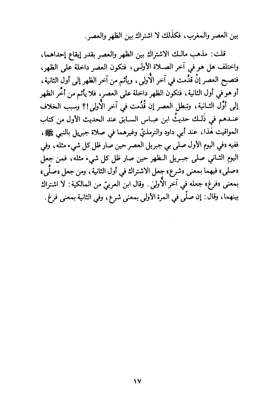 قلت: مذهب مالك الاشتراك بين الظهر والعصر بقدر إيقاع إحداهما، واختلف هل هو في آخر الصلاة الأولى، فتكون العصر داخلة على الظهر، فتصبح العصر إنْ قدِّمت في آخر الأُولى، ويأثم من آخر الظهر إلى أول الثانية، أو هو في أول الثانية، فتكون الظهر داخلة على العصر، فلا يأثم من أخَّر الظهر إلى أوَّل الثانية، وتبطل العصر إن قُدِّمت في آخر الاولى!؟ وسبب الخلاف عندهم في ذلك حديثُ ابن عباس السابق عند الحديث الأول من كتاب المواقيت هذا، عند أبي داود والترمذيّ وغيرهما في صلاة جبريل بالنبي -صلى الله عليه وسلم-، ففيه "في اليوم الأول صلى بي جبريل العصر حين صار ظل كل شيء مثله، وفي اليوم الثاني صلى جبريل الظهر حين صار ظل كل شيء مثله، فمن جعل "صلى" فيهما بمعنى "شرع" جعل الاشتراك في أول الثانية، ومن جعل "صلَّى" بمعنى "فرغ" جعله في آخر الأُولى. وقال ابن العربيّ من المالكية: لا اشتراك بينهما، وقال: إن صلّى في المرة الأولى بمعنى شرع، وفي الثانية بمعنى فرغ.