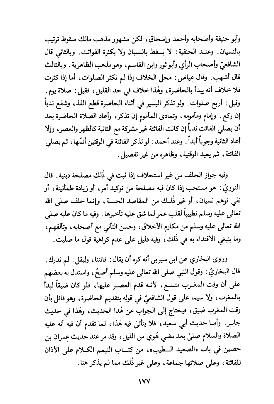 وأبو حنيفة وأصحابه وأحمد وإسحاق، لكن مشهور مذهب مالك سقوط ترتيب بالنسيان. وعند الحنفية: لا يسقط بالنسيان ولا بكثرة الفوائت. وبالثاني قال الشافعيّ وأصحاب الرأي وأبو ثور وابن القاسم، وهو مذهب الظاهرية. وبالثالث قال أشهب. وقال عِياض: محل الخلاف إذا لم تكثر الصلوات، أما إذا كثرت فلا خلاف أنه يبدأ بالحاضرة، وهذا خلاف في حد القليل، فقيل: صلاة يوم. وقيل: أربع صلوات. ولو تذكر اليسير في أثناء الحاضرة قطع الفذ، وشفع ندبًا إن ركع. وإمام ومأمومه، وتمادى المأموم إن تذكر، وأعاد الصلاة الحاضرة بعد أن يصلي الفائت ندبًا إن كانت الفائتة غير مشركة مع الثانية كالظهر والعصر، وإلا أعاد الثانية وجوبًا أبدًا. وعند أحمد: لو تذكر الفائتة في الوقتين أتمّها، ثم يصلي الفائتة، ثم يعيد الوقتية، وظاهره من غير تفصيل.