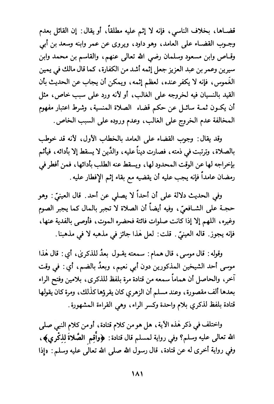 واختلف في ذكر هذه الآية، هل هو من كلام قتادة، أو من كلام النبي صلى الله تعالى عليه وسلم؟ وفي رواية لمسلم قال قتادة: {وَأَقِمِ الصَّلَاةَ لِذِكْرِي}، وفي رواية أخرى له عن قتادة، قال رسول الله صلى الله تعالى عليه وسلم: "إذا