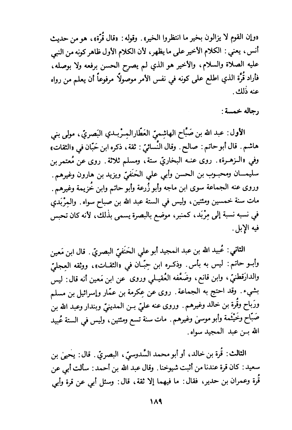 الثالث: قُرة بن خالد، أو أبو محمد السَّدوسيّ، البصري. قال: يحيى بن سعيد: كان قرة عندنا من أثبت شيوخنا. وقال عبد الله بن أحمد: سألت أبي عن قُرة وعمران بن حدير، فقال: ما فيهما إلا ثقة، قال: وسئل أبي عن قرة وأبي