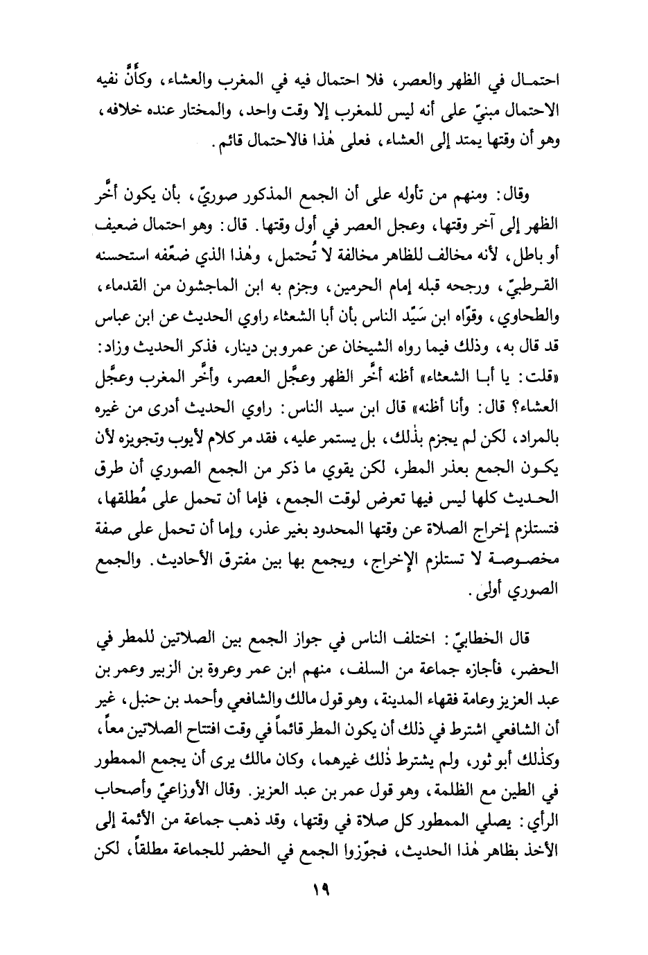 وقال: ومنهم من تأوله على أن الجمع المذكور صوريّ، بأن يكون أخَّر الظهر إلى آخر وقتها، وعجل العصر في أول وقتها. قال: وهو احتمال ضعيف أو باطل، لأنه مخالف للظاهر مخالفة لا تُحتمل، وهذا الذي ضعّفه استحسنه القرطبيّ، ورجحه قبله إمام الحرمين، وجزم به ابن الماجشون من القدماء، والطحاوي، وقوّاه ابن سَيّد الناس بأن أبا الشعثاء راوي الحديث عن ابن عباس قد قال به، وذلك فيما رواه الشيخان عن عمرو بن دينار، فذكر الحديث وزاد: "قلت: يا أبا الشعثاء" أظنه أخَّر الظهر وعجَّل العصر، وأخَّر المغرب وعجَّل العشاء؟ قال: وأنا أظنه" قال ابن سيد الناس: راوي الحديث أدرى من غيره بالمراد، لكن لم يجزم بذلك، بل يستمر عليه، فقد مر كلام لأيوب وتجويزه لأن يكون الجمع بعذر المطر، لكن يقوي ما ذكر من الجمع الصوري أن طرق الحديث كلها ليس فيها تعرض لوقت الجمع، فإما أن تحمل على مُطلقها، فتستلزم إخراج الصلاة عن وقتها المحدود بغير عذر، وإما أن تحمل على صفة مخصوصة لا تستلزم الإخراج، ويجمع بها بين مفترق الأحاديث. والجمع الصوري أولى.