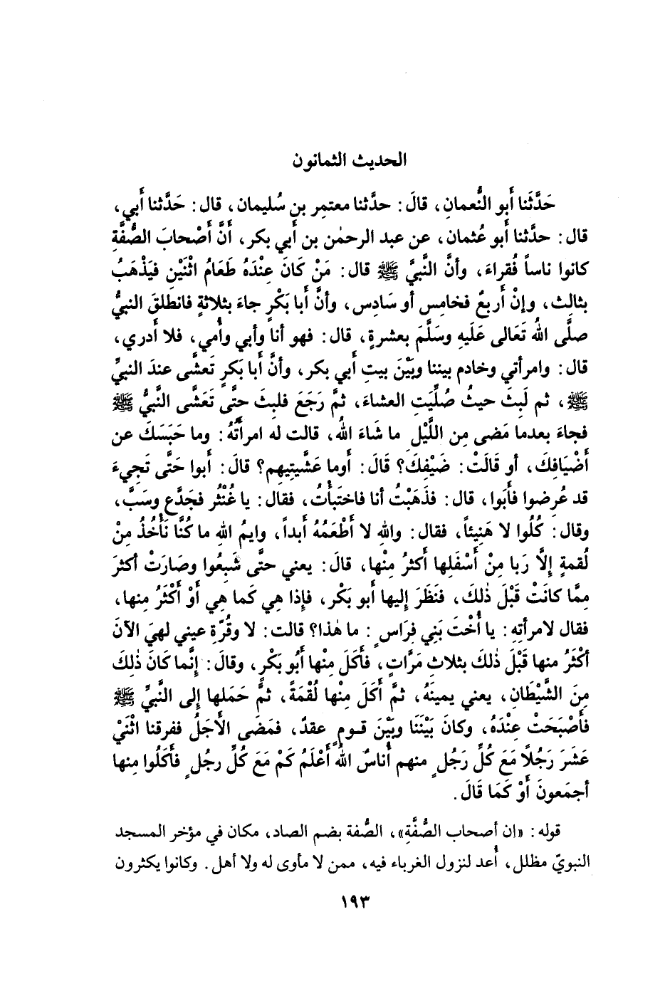 حَدَّثَنَا أَبُو النُّعْمَانِ، قَالَ: حَدَّثَنَا مُعْتَمِرُ بْنُ سُلَيْمَانَ، قَالَ: حَدَّثَنَا أَبِي، قال: حَدَّثَنَا أَبُو عُثْمَانَ، عَنْ عَبْدِ الرَّحْمَنِ بْنِ أَبِي بَكْرٍ، أَنَّ أَصْحَابَ الصُّفَّةِ كَانُوا أُنَاسًا فُقَرَاءَ، وَأَنَّ النَّبِيَّ -صلى الله عليه وسلم- قَالَ: "مَنْ كَانَ عِنْدَهُ طَعَامُ اثْنَيْنِ فَلْيَذْهَبْ بِثَالِثٍ، وَإِنْ أَرْبَعٌ فَخَامِسٌ أَوْ سَادِسٌ". وَأَنَّ أَبَا بَكْرٍ جَاءَ بِثَلاَثَةٍ فَانْطَلَقَ النَّبِيُّ -صلى الله عليه وسلم- بِعَشَرَةٍ، قَالَ فَهْوَ أَنَا وَأَبِي وَأُمِّي، فَلاَ أَدْرِي، قَالَ وَامْرَأَتِي وَخَادِمٌ بَيْنَنَا وَبَيْنَ بَيْتِ أَبِي بَكْرٍ. وَإِنَّ أَبَا بَكْرٍ تَعَشَّى عِنْدَ النَّبِيِّ -صلى الله عليه وسلم- ثُمَّ لَبِثَ حَيْثُ صُلِّيَتِ الْعِشَاءُ، ثُمَّ رَجَعَ فَلَبِثَ حَتَّى تَعَشَّى النَّبِيُّ -صلى الله عليه وسلم- فَجَاءَ بَعْدَ مَا مَضَى مِنَ اللَّيْلِ مَا شَاءَ اللَّهُ، قَالَتْ لَهُ امْرَأَتُهُ: وَمَا حَبَسَكَ عَنْ أَضْيَافِكَ، أَوْ قَالَتْ: ضَيْفِكَ؟ قَالَ: أَوَمَا عَشَّيْتِيهِمْ؟ قَالَتْ: أَبَوْا حَتَّى تَجِيءَ، قَدْ عُرِضُوا فَأَبَوْا، قَالَ: فَذَهَبْتُ أَنَا فَاخْتَبَأْتُ، فَقَالَ: يَا غُنْثَرُ فَجَدَّعَ وَسَبَّ، وَقَالَ: كُلُوا لاَ هَنِيئًا. فَقَالَ: وَاللَّهِ لاَ أَطْعَمُهُ أَبَدًا، وَايْمُ اللَّهِ مَا كُنَّا نَأْخُذُ مِنْ لُقْمَةٍ إِلاَّ رَبَا مِنْ أَسْفَلِهَا أَكْثَرُ مِنْهَا. قَالَ: يَعْنِي حَتَّى شَبِعُوا وَصَارَتْ أَكْثَرَ مِمَّا كَانَتْ قَبْلَ ذَلِكَ، فَنَظَرَ إِلَيْهَا أَبُو بَكْرٍ فَإِذَا هِيَ كَمَا هِيَ أَوْ أَكْثَرُ مِنْهَا. فَقَالَ لاِمْرَأَتِهِ: يَا أُخْتَ بَنِي فِرَاسٍ: مَا هَذَا؟ قَالَتْ: لاَ وَقُرَّةِ عَيْنِي لَهِيَ الآنَ أَكْثَرُ مِنْهَا قَبْلَ ذَلِكَ بِثَلاَثِ مَرَّاتٍ. فَأَكَلَ مِنْهَا أَبُو بَكْرٍ، وَقَالَ: إِنَّمَا كَانَ ذَلِكَ مِنَ الشَّيْطَانِ، يَعْنِى يَمِينَهُ، ثُمَّ أَكَلَ مِنْهَا لُقْمَةً، ثُمَّ حَمَلَهَا إِلَى النَّبِيِّ -صلى الله عليه وسلم- فَأَصْبَحَتْ عِنْدَهُ، وَكَانَ بَيْنَنَا وَبَيْنَ قَوْمٍ عَقْدٌ، فَمَضَى الأَجَلُ، فَفَرَّقَنَا اثْنَا عَشَرَ رَجُلاً، مَعَ كُلِّ رَجُلٍ مِنْهُمْ أُنَاسٌ، اللَّهُ أَعْلَمُ كَمْ مَعَ كُلِّ رَجُلٍ فَأَكَلُوا مِنْهَا أَجْمَعُونَ، أَوْ كَمَا قَالَ.