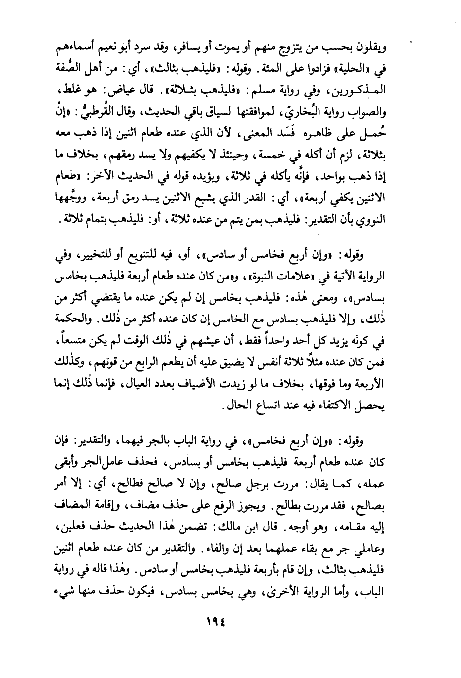 وقوله: "وإن أربع فخامس"، في رواية الباب بالجر فيهما، والتقدير: فإن كان عنده طعام أربعة فليذهب بخامس أو بسادس، فحذف عامل الجر وأبقى عمله، كما يقال: مررت برجل صالح، وإن لا صالح فطالح، أي: إلا أمر بصالح، فقد مررت بطالح. ويجوز الرفع على حذف مضاف، وإقامة المضاف إليه مقامه، وهو أوجه. قال ابن مالك: تضمن هذا الحديث حذف فعلين، وعاملي جر مع بقاء عملهما بعد إن والفاء. والتقدير من كان عنده طعام اثنين فليذهب بثالث، وإن قام بأربعة فليذهب بخامس أو سادس. وهذا قاله في رواية الباب، وأما الرواية الأخرى، وهي بخامس بسادس، فيكون حذف منها شيء