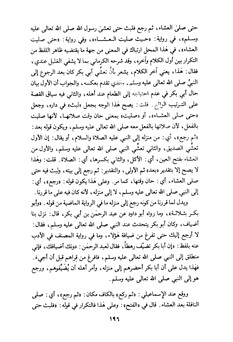حتى صلى العشاء، ثم رجع فلبث حتى تعشى رسول الله صلى الله تعالى عليه وسلم"، في رواية: "حيث صليت العشاء"، وفي رواية: "حتى صليت العشاء"، في هذا المحل ارتباك في المعنى من جهة ما يقتضيه ظاهر اللفظ من التكرار بين أول الكلام وآخره، وقد شرحه الكرماني بما لا يشفي الغليل عندي، فقال: هذا، يعني آخر الكلام، يشعر بأنَّ تعشِّي أبي بكر كان بعد الرجوع إلى النبيِّ صلى الله تعالى عليه وسلم، والذي تقدم بعكسه، والجواب أن الأول بيان حال أبي بكر في عدم احتياجه إلى الطعام عند أهله، والثاني فيه سياق القصة على الترتيب الواقع. قلت: يصح هذا الوجه بجعل "لبث" في داره، وجعل "حتى صلى العشاء"، أو "صليت" بمعنى حان وقت صلاتها؛ لأنها صليت بالفعل؛ لأن صلاتها بالفعل معه صلى الله تعالى عليه وسلم، ويكون قوله بعد: "ثم رجع"، أي: من منزله إلى النبي عليه الصلاة والسلام، أو يقال: إن الأول تعشِّي الصديق، والثاني تعشِّي النبي صلى الله تعالى عليه وسلم، والأول من العشاء بفتح العين، أي: الأكل، والثاني بكسرها، أي: الصلاة. قلت: وهذا لا يصح إلا بتقدير "بعد" ثم الأولى، والتقدير: ثم رجع إلى بيته، ولبث فيه حتى صلى العشاء، أي: حان وقتها، كما مرّ. وعلى هذا يكون قوله: "رجع"، أي: إلى النبي، صلى الله تعالى عليه وسلم، لا إلى منزله؛ لأنه كان فيه على ما قررنا.