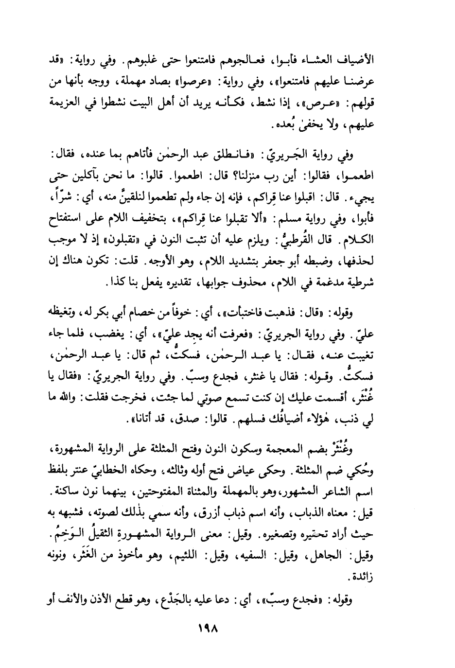 وفي رواية الجَريريّ: "فانطلق عبد الرحمن فأتاهم بما عنده، فقال: أطعموا، فقالوا: أين رب منزلنا؟ قال: اطعموا. قالوا: ما نحن بآكلين حتى يجيء. قال: اقبلوا عنا قِراكم، فإنه إن جاء ولم تطعموا لنلقينَّ منه، أي: شرًّا، فأبوا، وفي رواية مسلم: "ألا تقبلوا عنا قِراكم"، بتخفيف اللام على استفتاح الكلام. قال القُرطبيُّ: ويلزم عليه أن تثبت النون في "تقبلون" إذ لا موجب لحذفها، وضبطه أبو جعفر بتشديد اللام، وهو الأوجه. قلت: تكون هناك إن شرطية مدغمة في اللام، محذوف جوابها، تقديره يفعل بنا كذا.