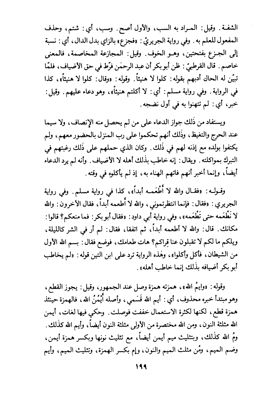 وقوله: "فقال والله لا أطْعَمه أبدًا"، كذا في رواية مسلم. وفي رواية الجريري: "فقال: فإنما انتظرتموني، والله لا أطعمه أبدًا، فقال الآخرون: والله لا نَطْعَمه حتى تَطْعَمه"، وفي رواية أبي داود: "فقال أبو بكر: فما منعكم؟ قالوا: مكانك. قال: والله لا أطعمه أبدًا، ثم اتفقا، فقال: لم أر في الشر كالليلة، ويلكم مالكم لا تقبلون عنا قِراكم؟ هات طعامك، فوضع فقال: بسم الله الأول من الشيطان، فأكل وأكلوا"، وهذه الرواية ترد على ابن التين قوله: "لم يخاطب أبو بكر أضيافه بذلك إنما خاطب أهله".