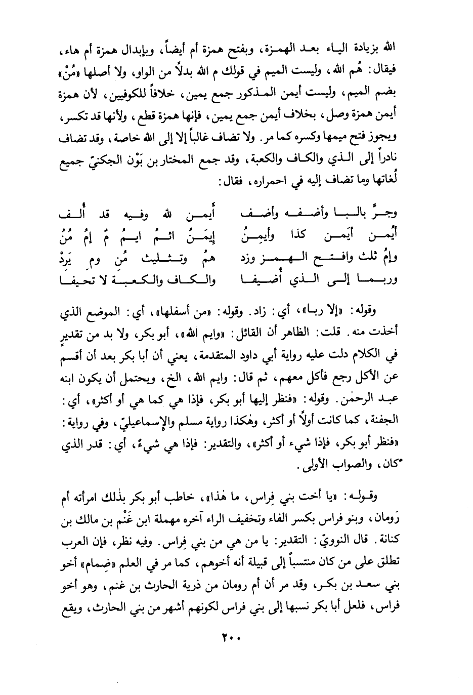 وقوله: "يا أخت بني فِراس، ما هذا"، خاطب أبو بكر بذلك امرأته أم رَومان، وبنو فراس بكسر الفاء وتخفيف الراء آخره مهملة ابن غَنْم بن مالك بن كنانة. قال النوويّ: التقدير: يا من هي من بني فِراس. وفيه نظر، فإن العرب تطلق على من كان منتسبًا إلى قبيلة أنه أخوهم، كما مرّ في العلم "ضِمام" أخو بني سعد بن بكر، وقد مرّ أن أم رومان من ذرية الحارث بن غنم، وهو أخو فراس، فلعل أبا بكر نسبها إلى بني فراس لكونهم أشهر من بني الحارث، ويقع