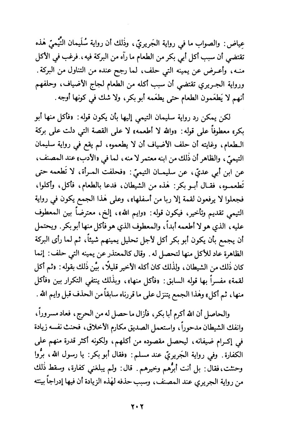 عِياض: والصواب ما في رواية الجَريريّ، وذلك أن رواية سُلَيمان التَّيْميّ هذه تقتضي أن سبب أكل أبي بكر من الطعام ما رآه من البركة فيه، فرغب في الأكل منه، وأعرض عن يمينه التي حلف، لما رجح عنده من التناول من البركة. ورواية الجريري تقتضي أن سبب أكله من الطعام لجاج الأضياف، وحلفهم أنهم لا يَطعَمون الطعام حتى يطعَمه أبو بكر، ولا شك في كونها أوجه.