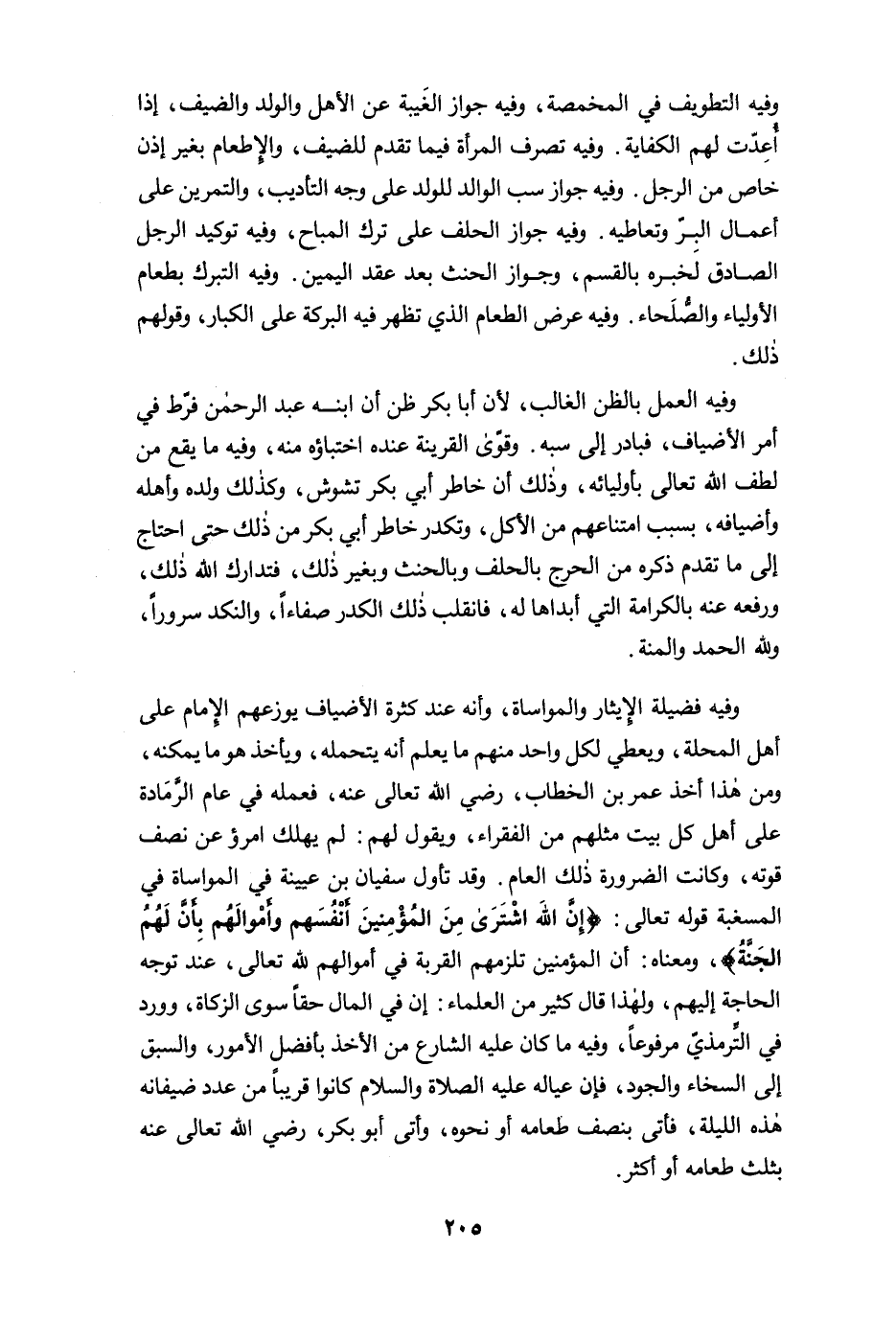 وفيه فضيلة الإيثار والمواساة، وأنه عند كثرة الأضياف يوزعهم الإِمام على أهل المحلة، ويعطي لكل واحد منهم ما يعلم أنه يتحمله، ويأخذ هو ما يمكنه، ومن هذا أخذ عمر بن الخطاب، رضي الله تعالى عنه، فعمله في عام الرَّمَادة على أهل كل بيت مثلهم من الفقراء، ويقول لهم: لم يهلك امرؤ عن نصف قوته، وكانت الضرورة ذلك العام. وقد تأول سفيان بن عيينة في المواساة في المسغبة قوله تعالى: {إِنَّ اللَّهَ اشْتَرَى مِنَ الْمُؤْمِنِينَ أَنْفُسَهُمْ وَأَمْوَالَهُمْ بِأَنَّ لَهُمُ الْجَنَّةَ}، ومعناه: أن المؤمنين تلزمهم القربة في أموالهم لله تعالى، عند توجه الحاجة إليهم، ولهذا قال كثير من العلماء: إن في المال حقًا سوى الزكاة، وورد في التِّرمذيّ مرفوعًا، وفيه ما كان عليه الشارع من الأخذ بأفضل الأمور، والسبق إلى السخاء والجود، فإن عياله عليه الصلاة والسلام كانوا قريبًا من عدد ضيفانه هذه الليلة، فأتى بنصف طعامه أو نحوه، وأتى أبو بكر، رضي الله تعالى عنه بثلث طعامه أو أكثر.