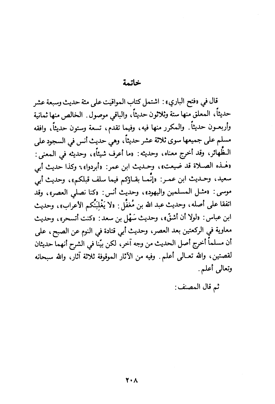 قال في "فتح الباري": اشتمل كتاب المواقيت على مئة حديث وسبعة عشر حديثًا، المعلق منها ستة وثلاثون حديثًا، والباقي موصول. الخالص منها ثمانية وأربعون حديثًا. والمكرر منها فيه، وفيما تقدم، تسعة وستون حديثًا، وافقه مسلم على جميعها سوى ثلاثة عشر حديثًا، وهي حديث أنس في السجود على الظَّهائر، وقد أخرج معناه، وحديثه: "ما أعرف شيئًا"، وحديثه في المعنى: "هذه الصلاة قد ضيعت"، وحديث ابن عمر: "أبردوا"، وكذا حديث أبي سعيد، وحديث ابن عمر: "إنَّما بقاؤكم فيما سلف قبلكم"، وحديث أبي موسى: "مثل المسلمين واليهود"، وحديث أنس: "كنا نصلي العصر"، وقد اتفقا على أصله، وحديث عبد الله بن مُغفل: "لا يَغْلِبَنكم الأعراب"، وحديث ابن عباس: "لولا أن أشقّ"، وحديث سَهْل بن سعد: "كنت أتسحر"، وحديث معاوية في الركعتين بعد العصر، وحديث أبي قتادة في النوم عن الصبح، على أن مسلمًا أخرج أصل الحديث من وجه آخر، لكن بيّنا في الشرح أنهما حديثان لقصتين، والله تعالى أعلم. وفيه من الآثار الموقوفة ثلاثة آثار، والله سبحانه وتعالى أعلم.