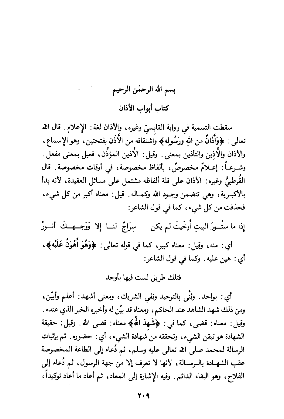 سقطت التسمية في رواية القابسيّ وغيره، والأذان لغة: الإعلام. قال الله تعالى: {وَأَذَانٌ مِنَ اللَّهِ وَرَسُولِهِ} وَاشتقاقه من الأَذَن بفتحتين، وهو الإسماع، والأذان والأَذِين والتأذين بمعنى. وقيل: الأَذين المؤذِّن، فعيل بمعنى مفعل. وشرعًا: إعلامٌ مخصوصٌ، بألفاظ مخصوصة، في أوقات مخصوصة. قال القُرطبيُّ وغيره: الأذان على قلة ألفاظه مشتمل على مسائل العقيدة؛ لأنه بدأ بالأكبرية، وهي تتضمن وجود الله وكماله. قيل: معناه أكبر من كل شيء، فحذفت من كل شيء، كما في قول الشاعر: