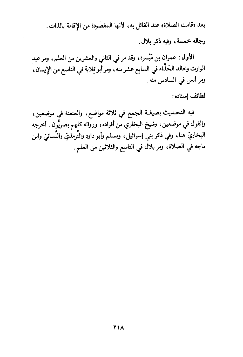 فيه التحديث بصيغة الجمع في ثلاثة مواضع، والعنعنة في موضعين، والقول في موضعين، وشيخ البخاري من أفراده، ورواته كلهم بصريُّون. أخرجه البخاريّ هنا، وفي ذكر بني إسرائيل، ومسلم وأبو داود والتِّرمذيّ والنَّسائيّ وابن ماجه في الصلاة، ومرّ بلال في التاسع والثلاثين من العلم.