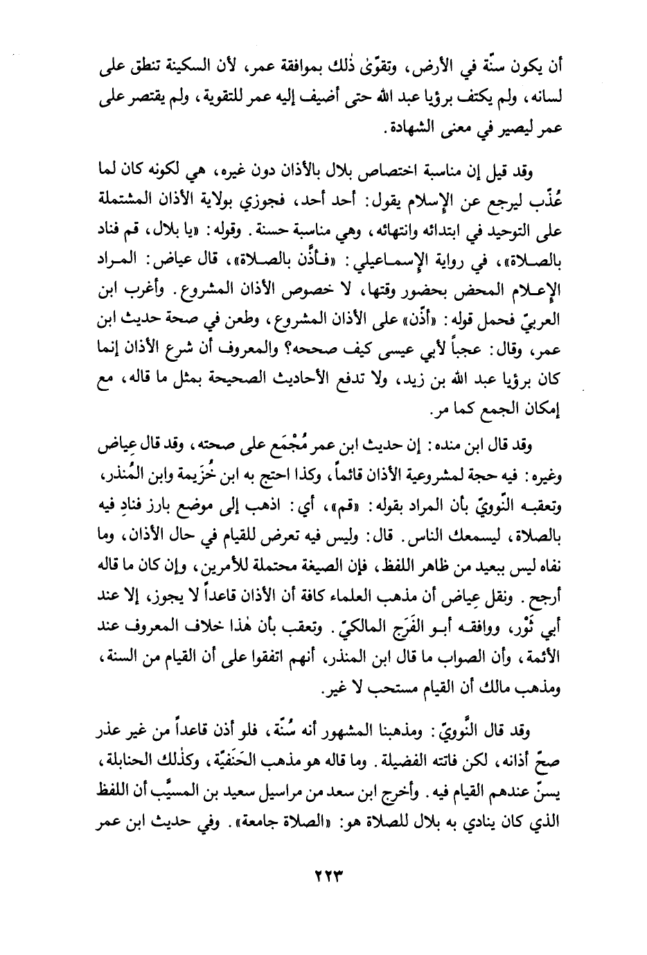 وقد قال ابن منده: إن حديث ابن عمر مُجْمَع على صحته، وقد قال عِياض وغيره: فيه حجة لمشروعية الأذان قائمًا، وكذا احتج به ابن خُزَيمة وابن المُنذر، وتعقبه النّوويّ بأن المراد بقوله: "قم"، أي: اذهب إلى موضع بارز فنادِ فيه بالصلاة، ليسمعك الناس. قال: وليس فيه تعرض للقيام في حال الأذان، وما نفاه ليس ببعيد من ظاهر اللفظ، فإن الصيغة محتملة للأمرين، وإن كان ما قاله أرجح. ونقل عِياض أن مذهب العلماء كافة أن الأذان قاعدًا لا يجوز، إلا عند أبي ثَوْر، ووافقه أبو الفَرَج المالكي. وتعقب بأن هذا خلاف المعروف عند الأئمة، وأن الصواب ما قال ابن المنذر، أنهم اتفقوا على أن القيام من السنة، ومذهب مالك أن القيام مستحب لا غير.