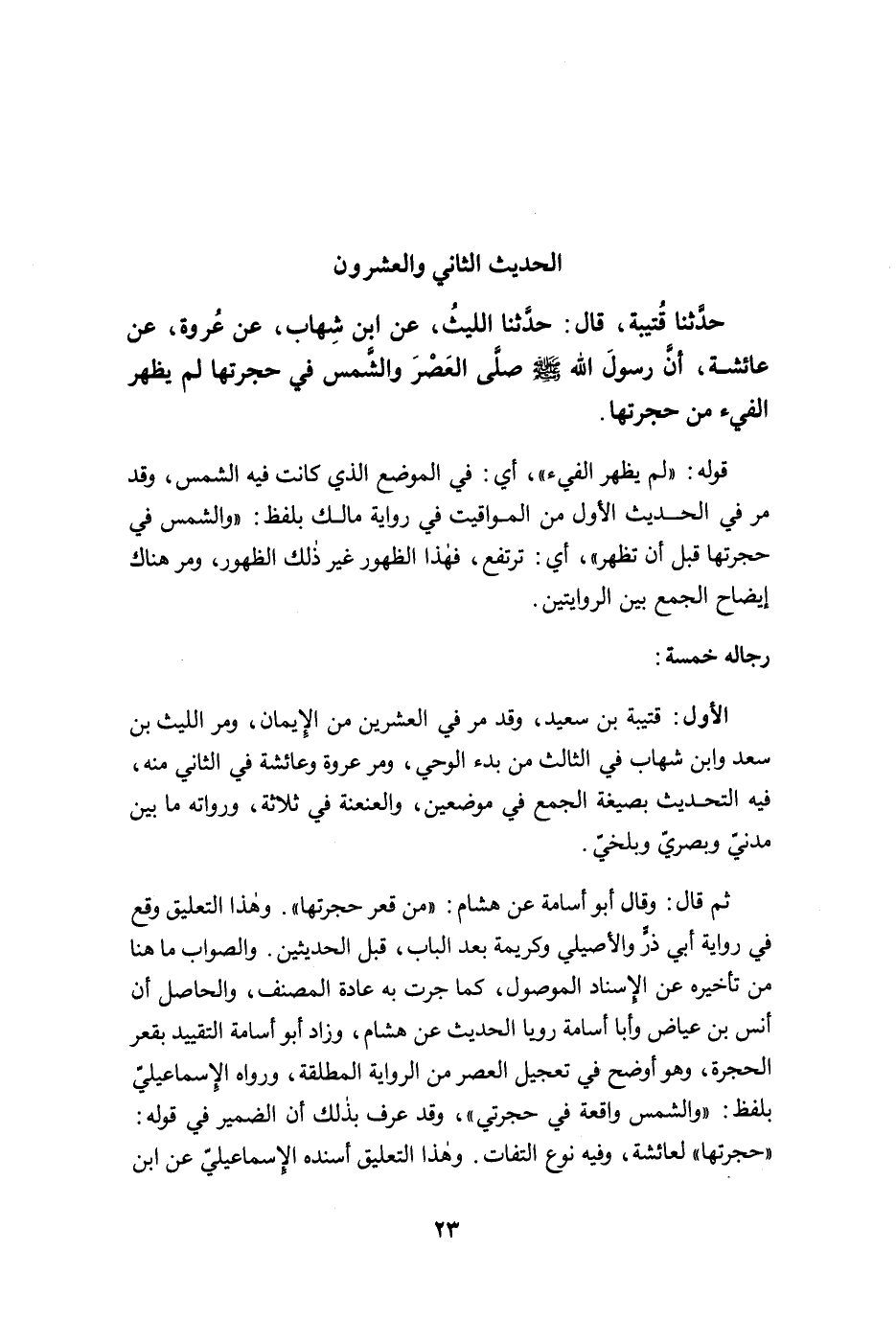 حَدَّثَنَا قُتَيْبَةُ، قَالَ: حَدَّثَنَا اللَّيْثُ، عَنِ ابْنِ شِهَابٍ، عَنْ عُرْوَةَ، عَنْ عَائِشَةَ، أَنَّ رَسُولَ اللَّهِ -صلى الله عليه وسلم- صَلَّى الْعَصْرَ وَالشَّمْسُ فِي حُجْرَتِهَا، لَمْ يَظْهَرِ الْفَيْءُ مِنْ حُجْرَتِهَا.