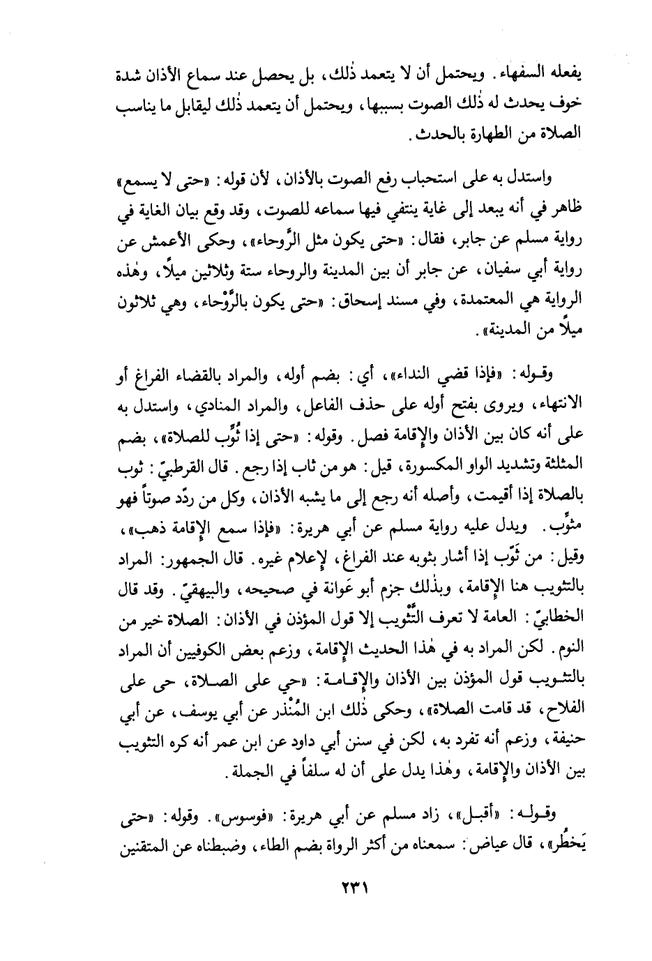 واستدل به على استحباب رفع الصوت بالأذان؛ لأن قوله: "حتى لا يسمع" ظاهر في أنه يبعد إلى غاية ينتفي فيها سماعه للصوت، وقد وقع بيان الغاية في رواية مسلم عن جابر، فقال: "حتى يكون مثل الروحاء"، وحكى الأعمش عن رواية أبي سفيان، عن جابر أن بين المدينة والروحاء ستة وثلاثين ميلًا، وهذه الرواية هي المعتمدة، وفي مسند إسحاق: "حتى يكون بالرَّوْحاء، وهي ثلاثون ميلًا من المدينة".