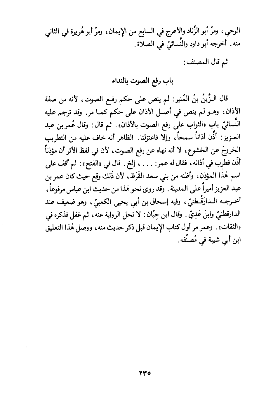 قال الزَّينُ بنُ المُنير: لم ينص على حكم رفع الصوت؛ لأنه من صفة الأذان، وهو لم ينص في أصل الأذان على حكم كما مرّ. وقد ترجم عليه النَّسائيّ باب "الثواب على رفع الصوت بالأذان". ثم قال: وقال عُمر بن عبد العزيز: أذِّن أذانًا سمحًا، وإلا فاعتزلنا. الظاهر أنه خاف عليه من التطريب الخروجَ عن الخشوع، لا أنه نهاه عن رفع الصوت؛ لأن في لفظ الأثر أن مؤذنًا أذن فطرب في أذانه، فقال له عمر: ... ، إلخ. قال في "الفتح": لم أقف على اسم هذا المؤذن، وأظنه من بني سعد القَرَظ؛ لأن ذلك وقع حيث كان عمر بن عبد العزيز أميرًا على المدينة. وقد روى نحو هذا من حديث ابن عباس مرفوعًا، أخرجه الدارَقُطنيّ، وفيه إسحاق بن أبي يحيى الكعبيّ، وهو ضعيف عند الدارقطنيّ وابنَ عَدِيّ. وقال ابن حِبَّان: لا تحل الرواية عنه، ثم غفل فذكره في "الثقات". وعمر مرّ أول كتاب الإيمان قبل ذكر حديث منه، ووصل هذا التعليق ابن أبي شيبة في مُصنّفه.