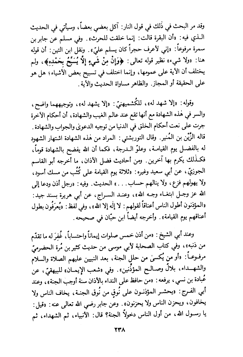 وعند أبي الشيخ: "من أذن خمس صلوات إيمانًا واحتسابًا، غُفِرَ له ما تقدَّم من ذنبه"، وفي كتاب الصحابة لأبي موسى من حديث كثير بن مُرة الحضرميّ موفوعًا: "أو من يُكسى من حلل الجنة، بعد النبيين عليهم الصلاة والسلام والشهداء، بلالٌ وصالح المؤذِّنين". وفي "شعب الإيمان" للبيهقيّ، عن عُبادة بن نسي، يرفعه: "من حافظ على النداء بالأذان سنة أوجب الجنة"، وعند أبي الفرج: "يحشر المؤذنون على نُوقٍ من نُوق الجنة، يخاف الناس ولا يخافون، ويحزن الناس ولا يحزنون". وعن جابر رضي الله تعالى عنه: "قيل: يا رسول الله، من أول الناس دخولًا الجنة؟ قال: الأنبياء، ثم الشهداء، ثم