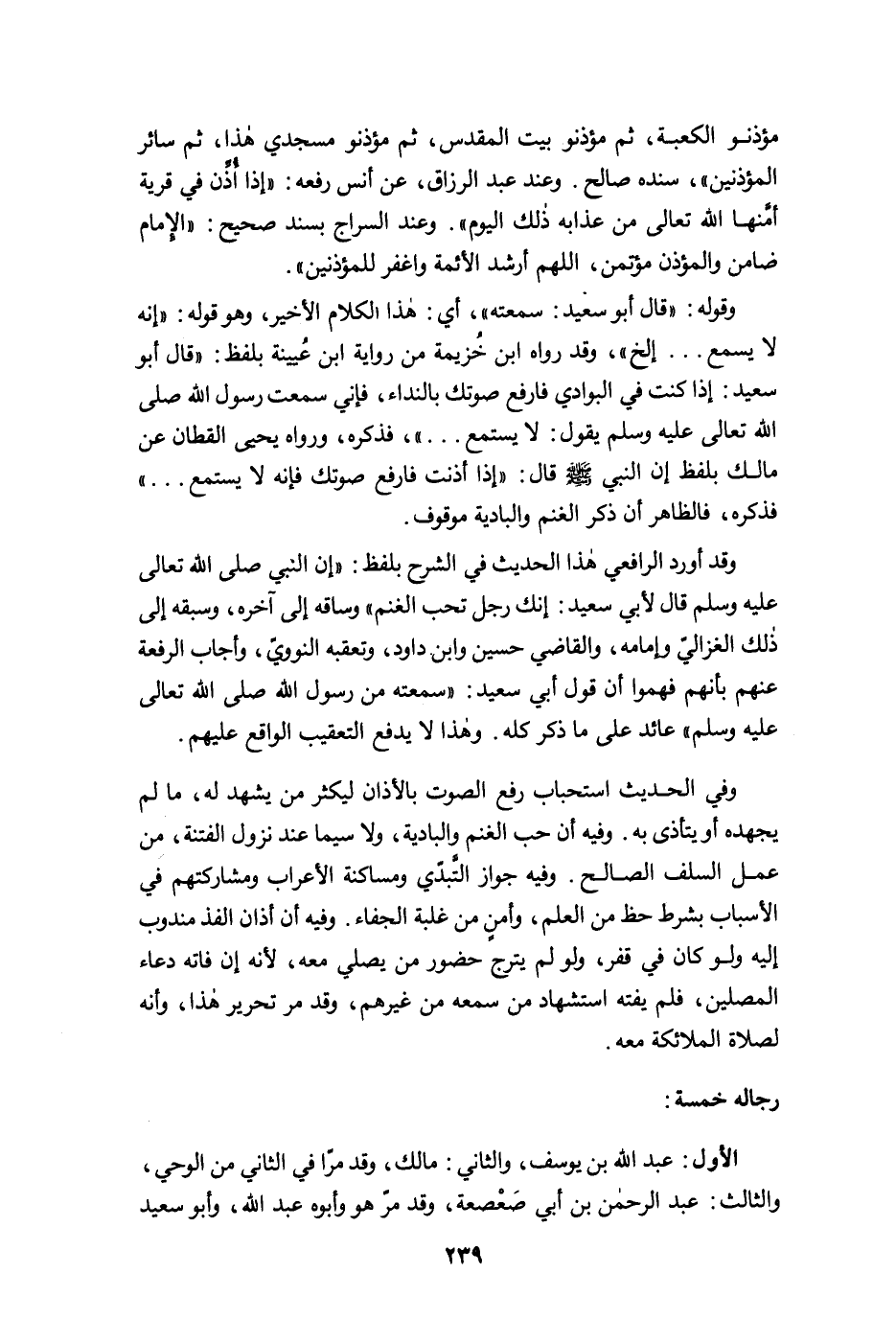 وقد أورد الرافعي هذا الحديث في الشرح بلفظ: "إن النبي صلى الله تعالى عليه وسلم قال لأبي سعيد: إنك رجل تحب الغنم" وساقه إلى آخره، وسبقه إلى ذلك الغزاليّ وإمامه، والقاضي حسين وابن داود، وتعقبه النوويّ، وأجاب الرفعة عنهم بأنهم فهموا أن قول أبي سعيد: "سمعته من رسول الله صلى الله تعالى عليه وسلم" عائد على ما ذكر كله. وهذا لا يدفع التعقيب الواقع عليهم.