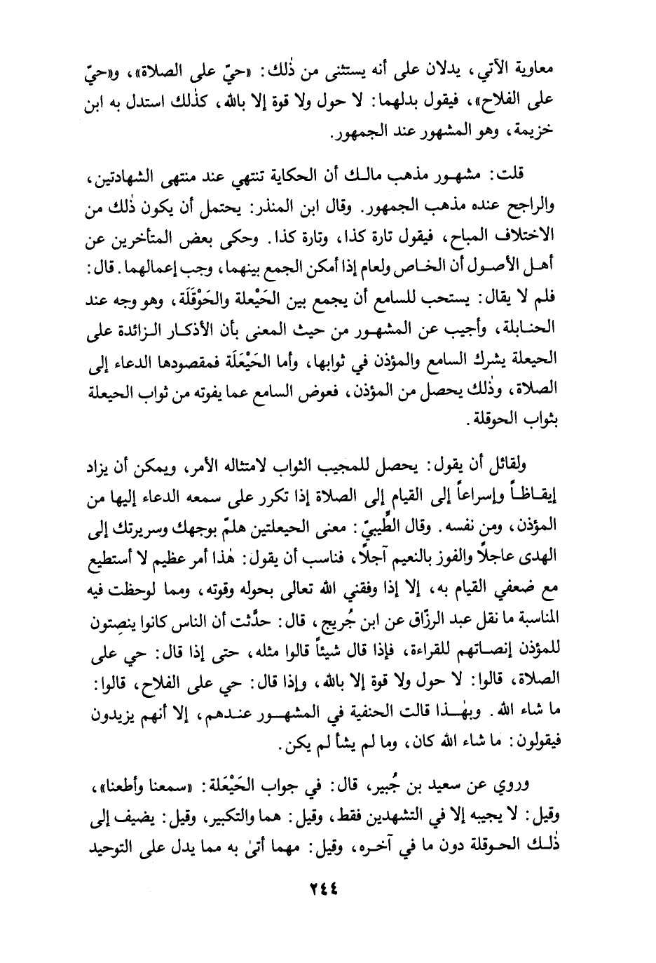 قلت: مشهور مذهب مالك أن الحكاية تنتهي عند منتهى الشهادتين، والراجح عنده مذهب الجمهور. وقال ابن المنذر: يحتمل أن يكون ذلك من الاختلاف المباح، فيقول تارة كذا، وتارة كذا. وحكى بعض المتأخرين عن أهل الأصول أن الخاص والعام إذا أمكن الجمع بينهما، وجب إعمالهما. قال: فلم لا يقال: يستحب للسامع أن يجمع بين الحَيْعلة والحَوْقَلَة، وهو وجه عند الحنابلة، وأجيب عن المشهور من حيث المعنى بأن الأذكار الزائدة على الحيعلة يشرك السامع والمؤذن في ثوابها، وأما الحَيْعَلَة فمقصودها الدعاء إلى الصلاة، وذلك يحصل من المؤذن، فعوض السامع عما يفوته من ثواب الحيعلة بثواب الحوقلة.