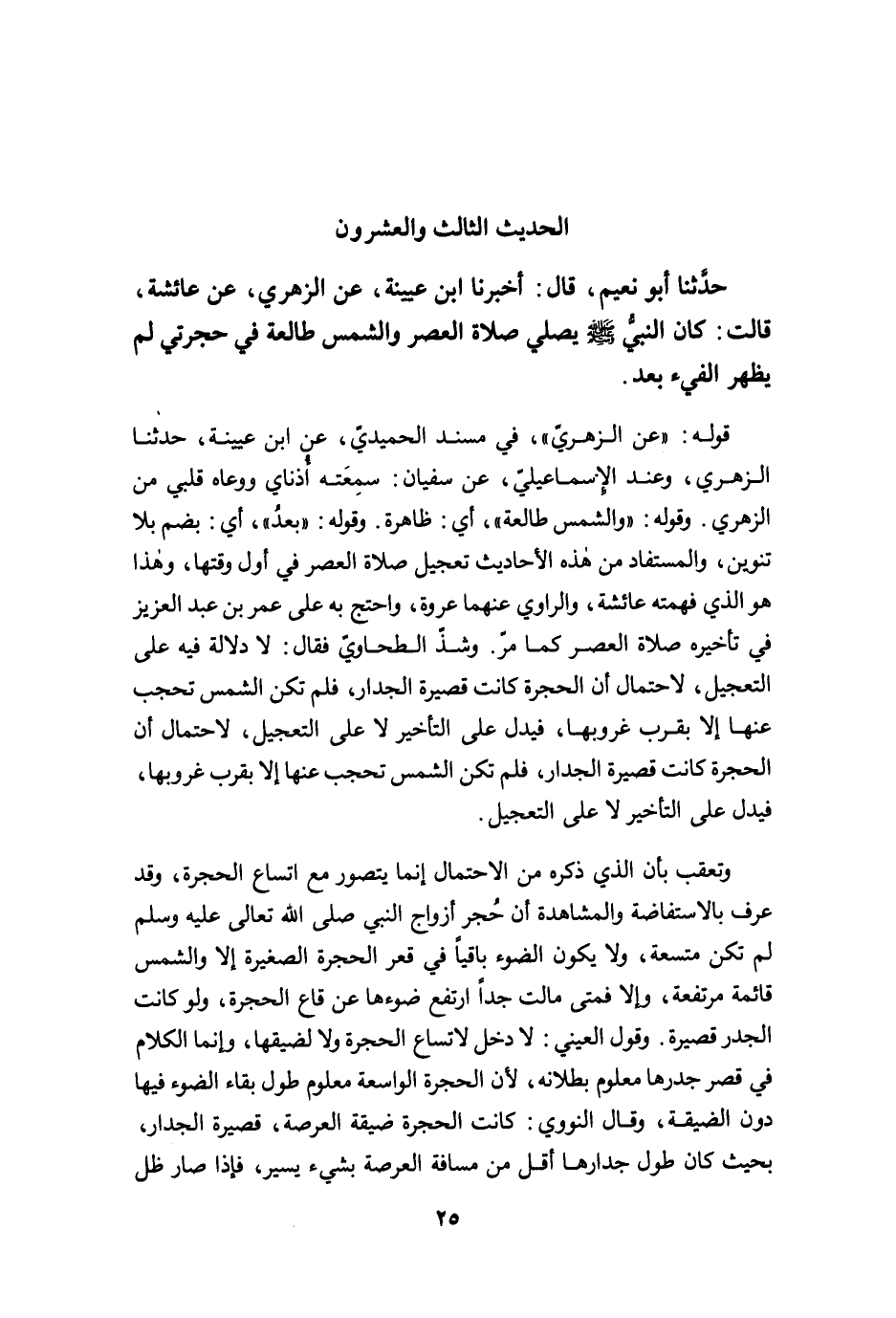 وتعقب بأن الذي ذكره من الاحتمال إنما يتصور مع اتساع الحجرة، وقد عرف بالاستفاضة والمشاهدة أن حُجر أزواج النبي صلى الله تعالى عليه وسلم لم تكن متسعة، ولا يكون الضوء باقيًا في قعر الحجرة الصغيرة إلا والشمس قائمة مرتفعة، وإلا فمتى مالت جدًا ارتفع ضوءها عن قاع الحجرة، ولو كانت الجدر قصيرة. وقول العيني: لا دخل لاتساع الحجرة ولا لضيقها، وإنما الكلام في قصر جدرها معلوم بطلانه، لأن الحجرة الواسعة معلوم طول بقاء الضوء فيها دون الضيقة، وقال النووي: كانت الحجرة ضيقة العرصة، قصيرة الجدار، بحيث كان طول جدارها أقل من مسافة العرصة بشيء يسير، فإذا صار ظل