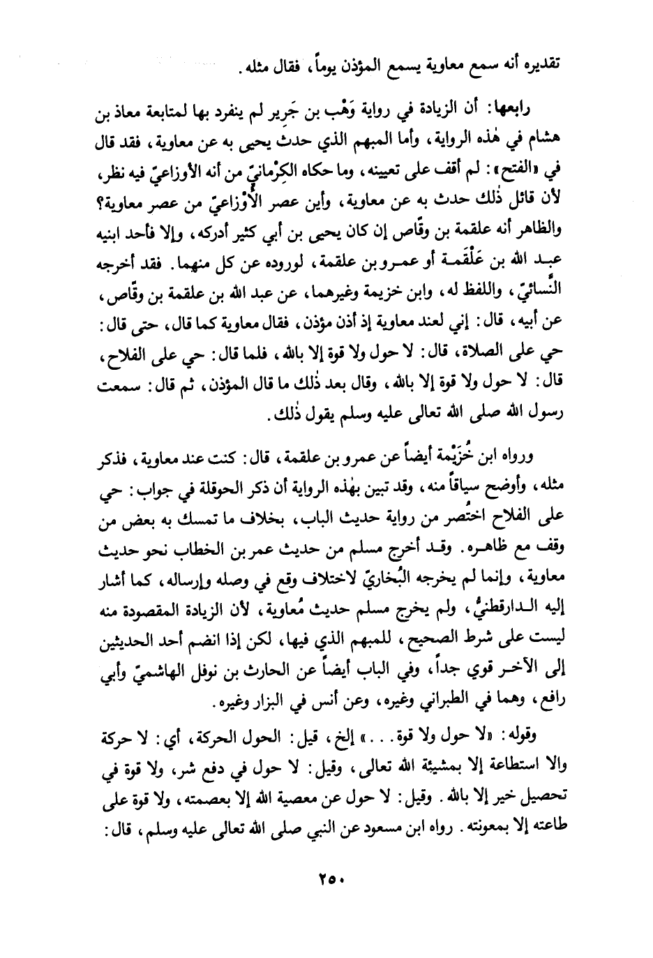 ورواه ابن خُزَيْمة أيضًا عن عمرو بن علقمة، قال: كنت عند معاوية، فذكر مثله، وأوضح سياقًا منه، وقد تبين بهذه الرواية أن ذكر الحوقلة في جواب: حي على الفلاح اختُصر من رواية حديث الباب، بخلاف ما تمسك به بعض من وقف مع ظاهره. وقد أخرج مسلم من حديث عمر بن الخطاب نحو حديث معاوية، وإنما لم يخرجه البُخاريّ لاختلاف وقع في وصله وإرساله، كما أشار إليه الدارقطنيُّ، ولم يخرج مسلم حديث مُعاوية؛ لأن الزيادة المقصودة منه ليست على شرط الصحيح، للمبهم الذي فيها، لكن إذا انضم أحد الحديثين إلى الآخر قوي جدًا، وفي الباب أيضًا عن الحارث بن نوفل الهاشميّ وأبي رافع، وهما في الطبراني وغيره، وعن أنس في البزَّار وغيره.