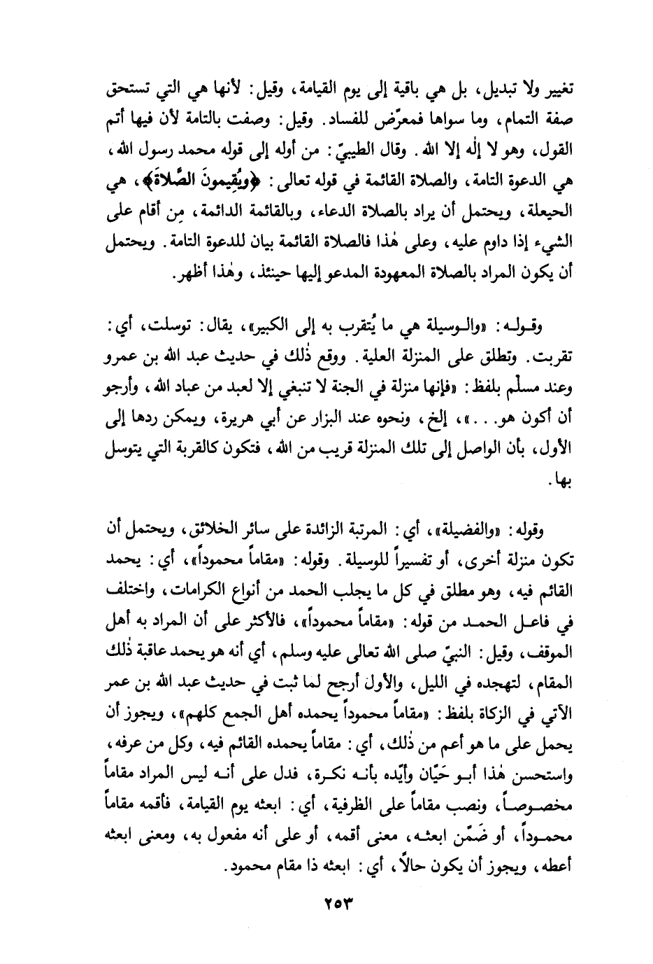 تغيير ولا تبديل، بل هي باقية إلى يوم القيامة، وقيل: لأنها هي التي تستحق صفة التمام، وما سواها فمعرّض للفساد. وقيل: وصفت بالتامة لأن فيها أتم القول، وهو لا إله إلا الله. وقال الطيبيّ: من أوله إلى قوله محمد رسول الله، هي الدعوة التامة، والصلاة القائمة في قوله تعالى: {وَيُقِيمُونَ الصَّلَاةَ}، هي الحيعلة، ويحتمل أن يراد بالصلاة الدعاء، وبالقائمة الدائمة، مِن أقام على الشيء إذا داوم عليه، وعلى هذا فالصلاة القائمة بيان للدعوة التامة. ويحتمل أن يكون المراد بالصلاة المعهودة المدعو إليها حينئذ، وهذا أظهر.