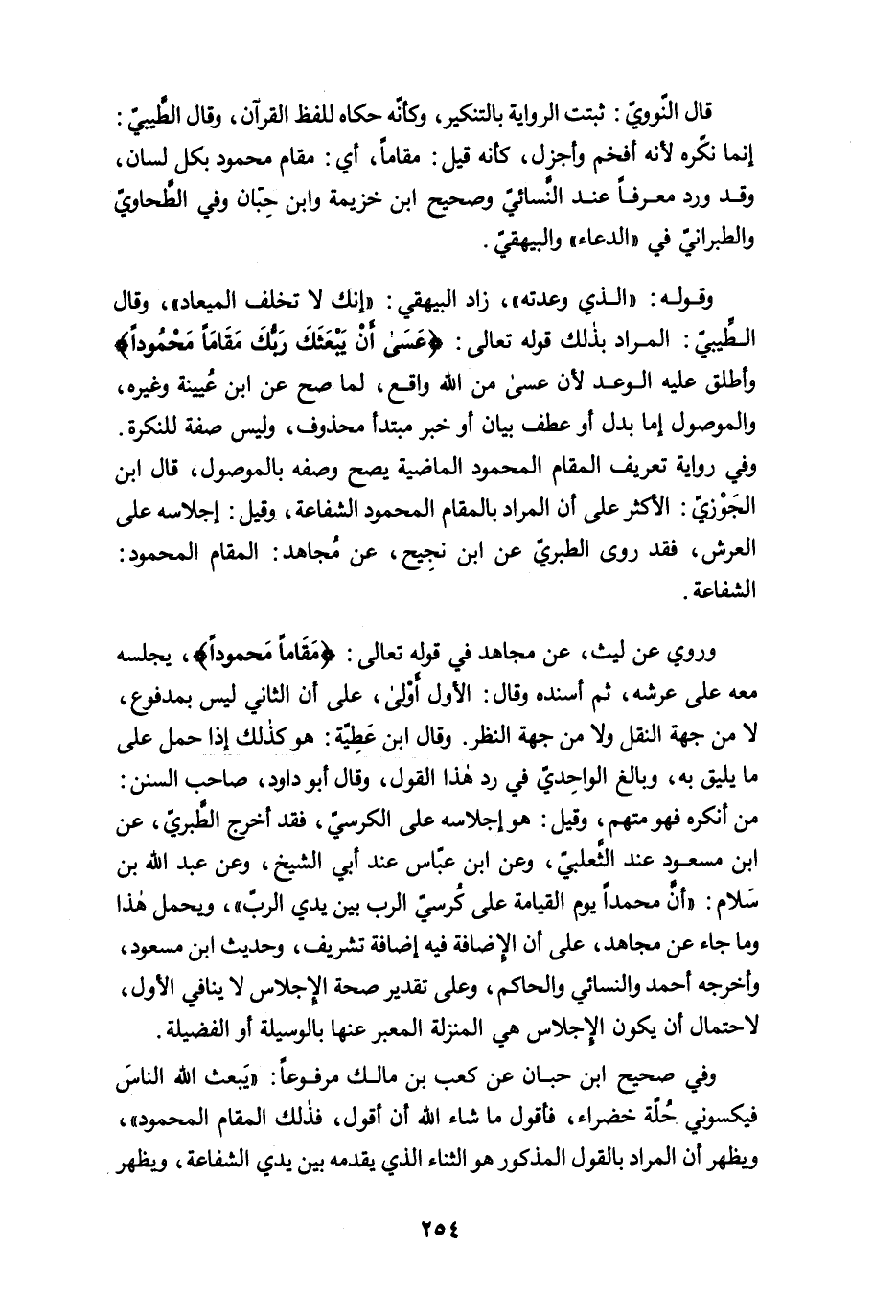 وروي عن ليث، عن مجاهد في قوله تعالى: {مَقَامًا مَحْمُودًا} يجلسه معه على عرشه، ثم أسنده وقال: الأول أَوْلي، على أن الثاني ليس بمدفوع، لا من جهة النقل ولا من جهة النظر. وقال ابن عَطِيّة: هو كذلك إذا حمل على ما يليق به، وبالغ الواحِديّ في رد هذا القول، وقال أبو داود، صاحب السنن: من أنكره فهو متهم، وقيل: هو إجلاسه على الكرسيّ، فقد أخرج الطَّبريّ، عن ابن مسعود عند الثَّعلبيّ، وعن ابن عباس عند أبي الشيخ، وعن عبد الله بن سَلام: "أنَّ محمدًا يوم القيامة على كُرسيّ الرب بين يدي الربّ"، ويحمل هذا وما جاء عن مجاهد، على أن الإضافة فيه إضافة تشريف، وحديث ابن مسعود، وأخرجه أحمد والنَّسائيّ والحاكم، وعلى تقدير صحة الإجلاس لا ينافي الأول، لاحتمال أن يكون الإجلاس هي المنزلة المعبر عنها بالوسيلة أو الفضيلة.