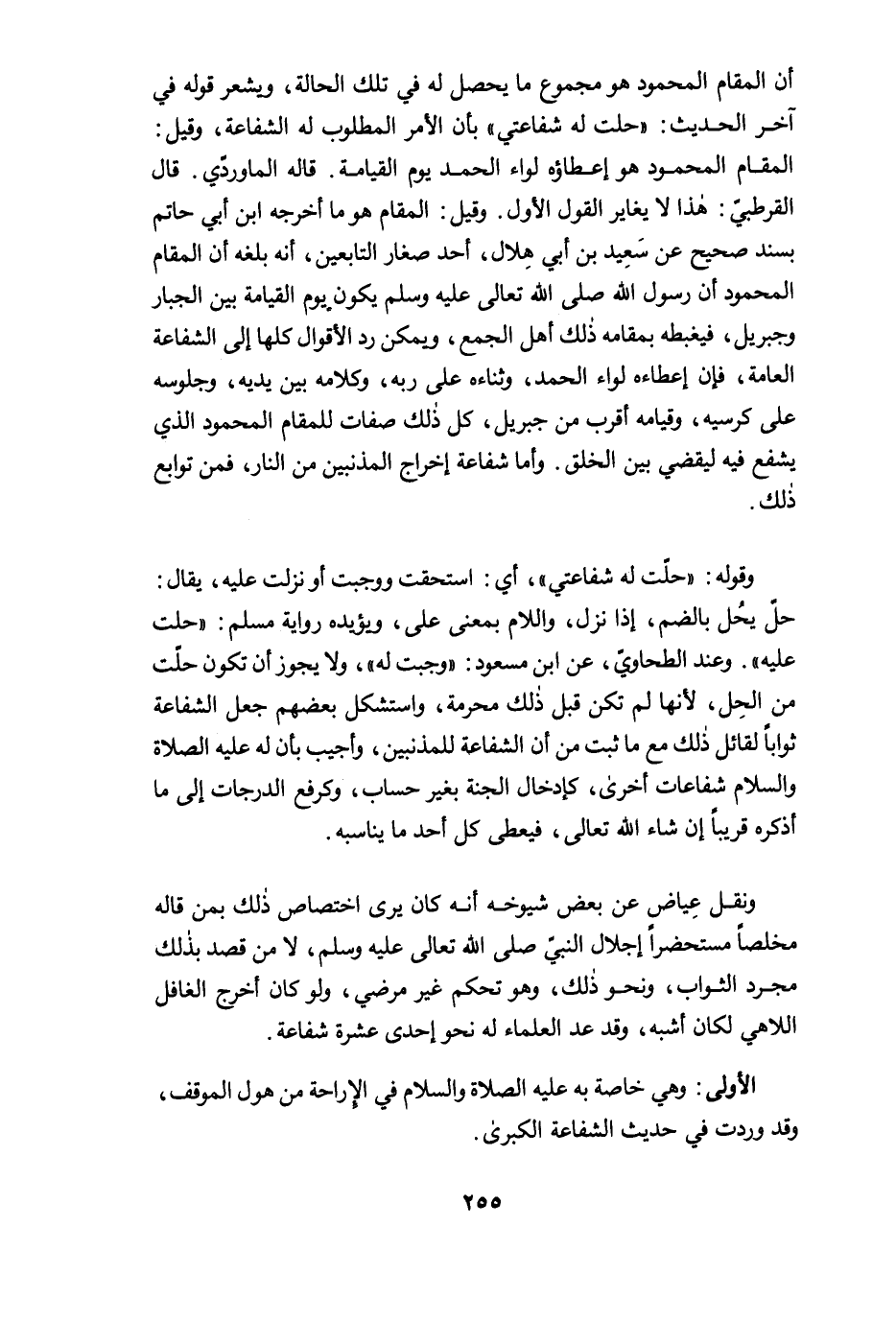 وقوله: "حلّت له شفاعتي"، أي: استحقت ووجبت أو نزلت عليه، يقال: حلّ يحُل بالضم، إذا نزل، واللام بمعنى على، ويؤيده رواية مسلم: "حلت عليه". وعند الطحاويّ، عن ابن مسعود: "وجبت له"، ولا يجوز أن تكون حلّت من الحِل؛ لأنها لم تكن قبل ذلك محرمة، واستشكل بعضهم جعل الشفاعة ثوابًا لقائل ذلك مع ما ثبت من أن الشفاعة للمذنبين، وأجيب بأن له عليه الصلاة والسلام شفاعات أخرى، كإدخال الجنة بغير حساب، وكرفع الدرجات إلى ما أذكره قريبًا إن شاء الله تعالى، فيعطى كل أحد ما يناسبه.