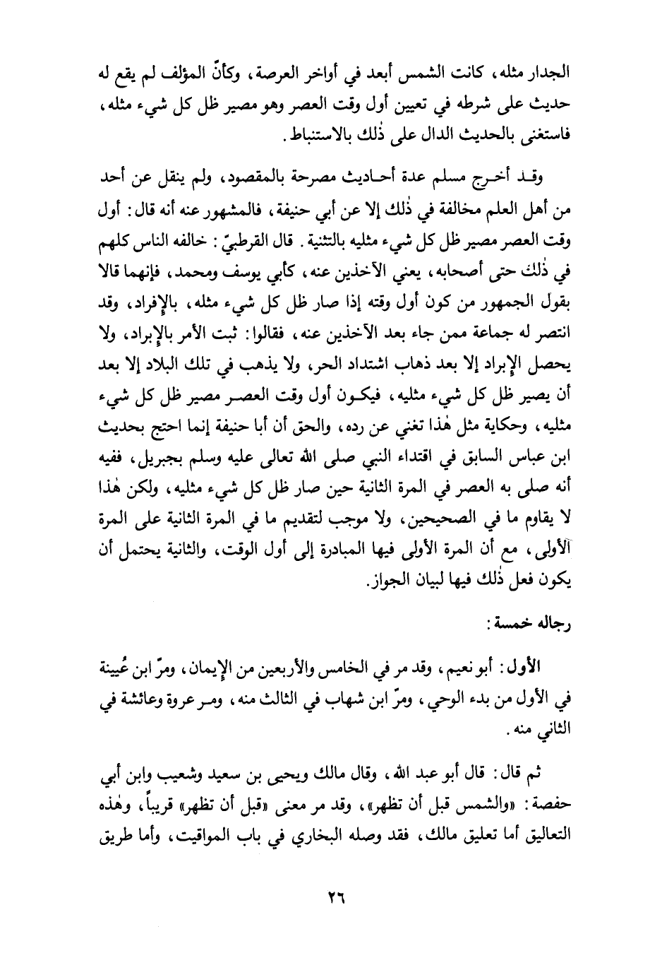 وقد أخرج مسلم عدة أحاديث مصرحة بالمقصود، ولم ينقل عن أحد من أهل العلم مخالفة في ذلك إلا عن أبي حنيفة، فالمشهور عنه أنه قال: أول وقت العصر مصير ظل كل شيء مثليه بالتثنية. قال القرطبيّ: خالفه الناس كلهم في ذلك حتى أصحابه، يعني الآخذين عنه، كأبي يوسف ومحمد، فإنهما قالا بقول الجمهور من كون أول وقته إذا صار ظل كل شيء مثله، بالإفراد، وقد انتصر له جماعة ممن جاء بعد الآخذين عنه، فقالوا: ثبت الأمر بالإبراد، ولا يحصل الإبراد إلا بعد ذهاب اشتداد الحر، ولا يذهب في تلك البلاد إلا بعد أن يصير ظل كل شيء مثليه، فيكون أول وقت العصر مصير ظل كل شيء مثليه، وحكاية مثل هذا تغني عن رده، والحق أن أبا حنيفة إنما احتج بحديث ابن عباس السابق في اقتداء النبي صلى الله تعالى عليه وسلم بجبريل، ففيه أنه صلى به العصر في المرة الثانية حين صار ظل كل شيء مثليه، ولكن هذا لا يقاوم ما في الصحيحين، ولا موجب لتقديم ما في المرة الثانية على المرة الأولى، مع أن المرة الأولى فيها المبادرة إلى أول الوقت، والثانية يحتمل أن يكون فعل ذلك فيها لبيان الجواز.