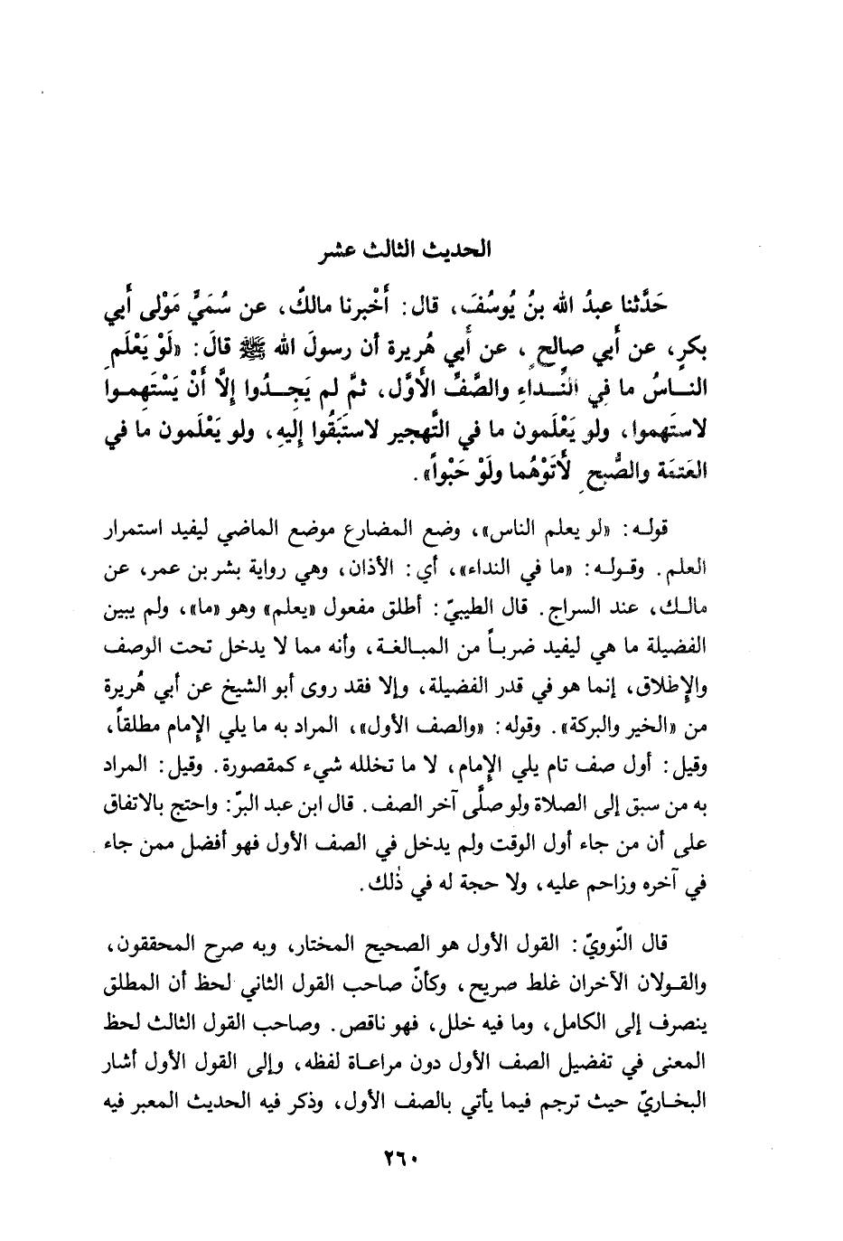 قال النّوويّ: القول الأول هو الصحيح المختار، وبه صرح المحققون، والقولان الآخران غلط صريح، وكأنّ صاحب القول الثاني لحظ أن المطلق ينصرف إلى الكامل، وما فيه خلل، فهو ناقص. وصاحب القول الثالث لحظ المعنى في تفضيل الصف الأول دون مراعاة لفظه، وإلى القول الأول أشار البخاريّ حيث ترجم فيما يأتي بالصف الأول، وذكر فيه الحديث المعبر فيه