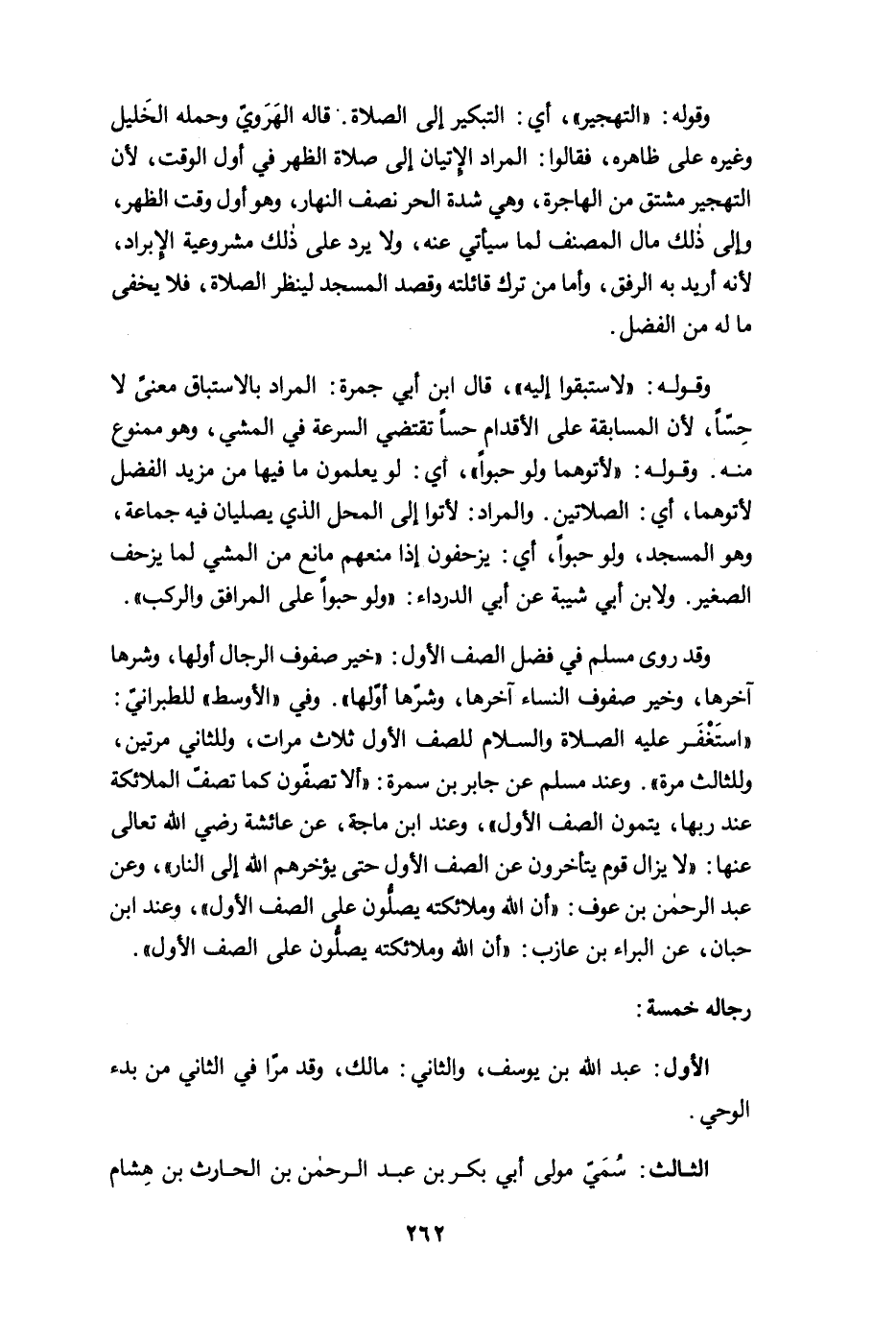 وقوله:"التهجير"، أي: التبكير إلى الصلاة. قاله الهَرَويّ وحمله الخَليل وغيره على ظاهره، فقالوا: المراد الإتيان إلى صلاة الظهر في أول الوقت؛ لأن التهجير مشتق من الهاجرة، وهي شدة الحر نصف النهار، وهو أول وقت الظهر، وإلي ذلك مال المصنف لما سيأتي عنه، ولا يرد على ذلك مشروعية الإبراد، لأنه أريد به الرفق، وأما من ترك قائلته وقصد المسجد لينظر الصلاة، فلا يخفى ما له من الفضل.