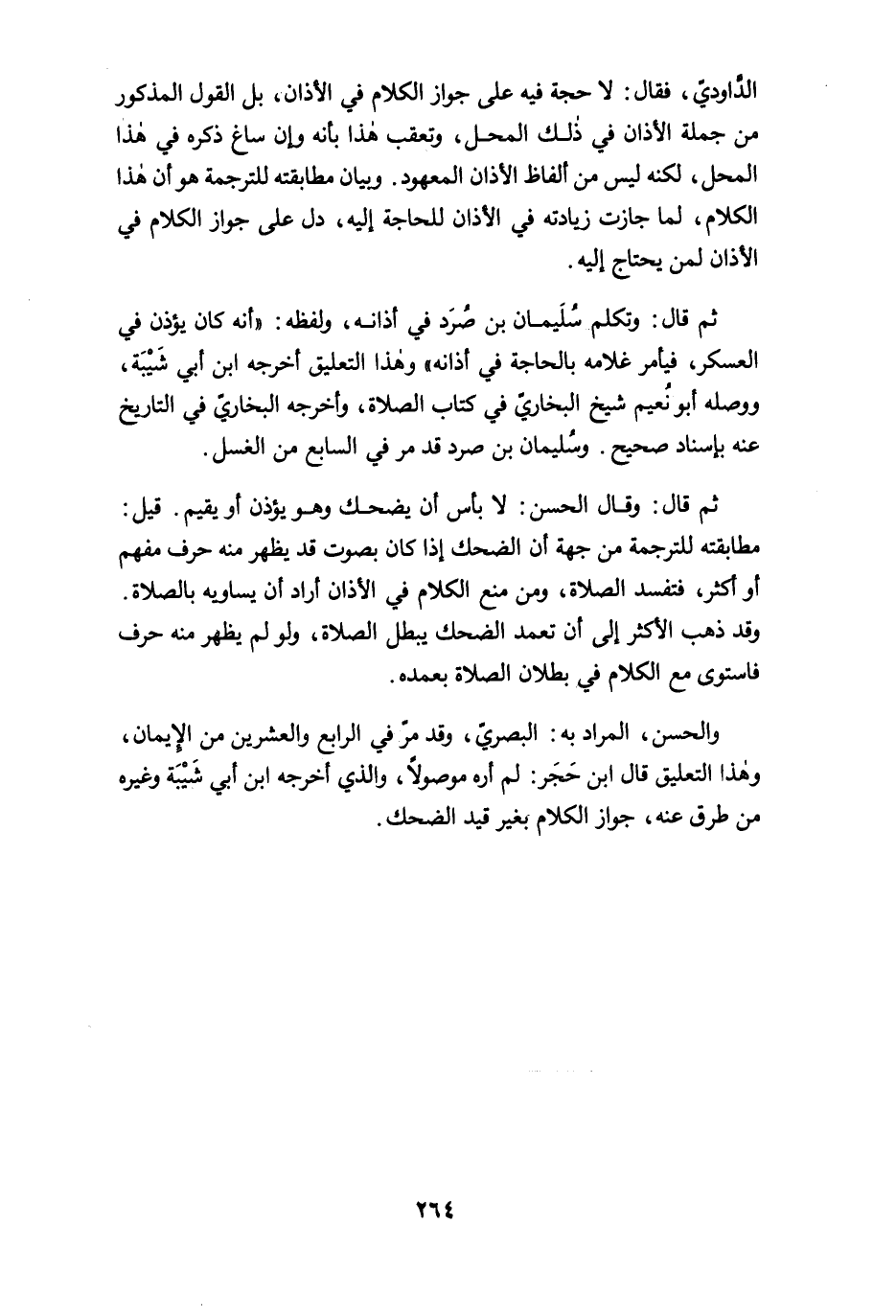 ثم قال: وتكلم سُلَيمان بن صُرَد في أذانه، ولفظه: "أنه كان يؤذن في العسكر، فيأمر غلامه بالحاجة في أذانه" وهذا التعليق أخرجه ابن أبي شَيْبَة، ووصله أبو نُعيم شيخ البخاريّ في كتاب الصلاة، وأخرجه البخاريّ في التاريخ عنه بإسناد صحيح. وسُليمان بن ورد قد مرّ في السابع من الغسل.