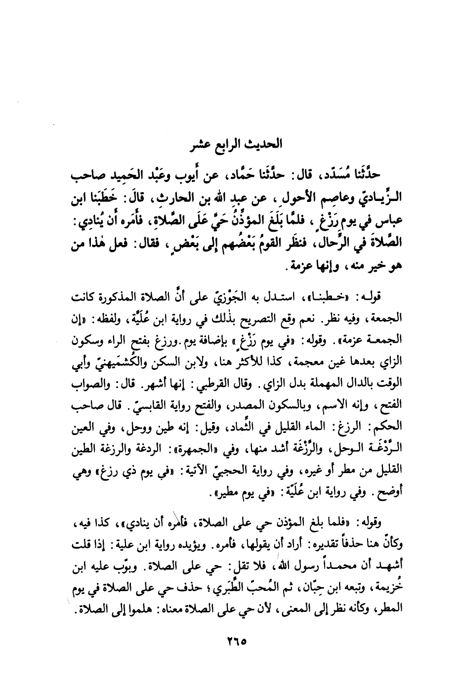 حَدَّثَنَا مُسَدَّدٌ، قَالَ: حَدَّثَنَا حَمَّادٌ، عَنْ أَيُّوبَ وَعَبْدِ الْحَمِيدِ صَاحِبِ الزِّيَادِيِّ وَعَاصِمٍ الأَحْوَلِ، عَنْ عَبْدِ اللَّهِ بْنِ الْحَارِثِ، قَالَ: خَطَبَنَا ابْنُ عَبَّاسٍ فِي يَوْمٍ رَدْغٍ، فَلَمَّا بَلَغَ الْمُؤَذِّنُ حَيَّ عَلَى الصَّلاَةِ. فَأَمَرَهُ أَنْ يُنَادِيَ الصَّلاَةُ فِي الرِّحَالِ. فَنَظَرَ الْقَوْمُ بَعْضُهُمْ إِلَى بَعْضٍ، فَقَالَ: فَعَلَ هَذَا مَنْ هُوَ خَيْرٌ مِنْهُ، وَإِنَّهَا عَزْمَةٌ.