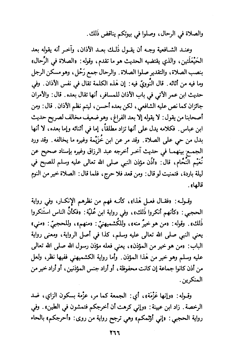 وعند الشافعية وجه أن يقول ذلك بعد الأذان، وآخر أنه يقوله بعد الحَيْعَلَتين، والذي يقتضيه الحديث هو ما تقدم، وقوله: "الصلاة في الرِّحال" بنصب الصلاة، والتقدير صلوا الصلاة. والرحال جمع رَحْل، وهو مسكن الرجل وما فيه من أثاثه. قال النَّوويّ فيه: أن هذه الكلمة تقال في نفس الأذان. وفي حديث ابن عمر الآتي في باب الأذان للمسافر، أنها تقال بعده. قال: والأمران جائزان كما نص عليه الشافعي، لكن بعده أحسن، ليتم نظم الأذان. قال: ومن أصحابنا من يقول: لا يقوله إلا بعد الفراغ، وهو ضعيف مخالف لصريح حديث ابن عباس. فكلامه يدل على أنها تزاد مطلقًا، إما في أثنائه وإما بعده، لا أنها بدل من حي على الصلاة. وقد مرَّ عن ابن خُزَيْمة وغيره ما يخالفه. وقد ورد الجمع بينهما في حديث آخر أخرجه عبد الرزاق وغيره بإسناد صحيح عن نُعَيْم النَّخَّام، قال: "أذّن مؤذن النبي صلى الله تعالى عليه وسلم للصبح في ليلة باردة، فتمنيت لو قال: ومن قعد فلا حرج، فلما قال: الصلاة خير من النوم قالها".