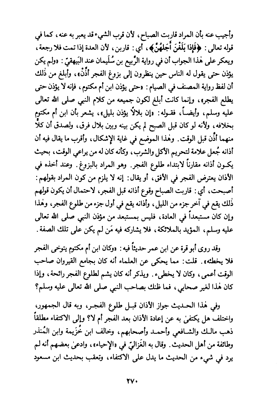 وأجيب عنه بأنّ المراد قاربت الصباح؛ لأن قرب الشيء قد يعبر به عنه، كما في قوله تعالى: {فَإِذَا بَلَغْنَ أَجَلَهُنَّ}، أي: قاربن؛ لأن العدة إذا تمت فلا رجعة، ويعكر على هذا الجواب أن في رواية الرَّبيع بن سُلَيمان عند البَيهقيّ: "ولم يكن يؤذن حتى يقول له الناس حين ينظرون إلى بزوغ الفجر أذِّنْ"، وأبلغ من ذلك أن لفظ رواية المصنف في الصيام: "حتى يؤذن ابن أم مكتوم، فإنه لا يؤذن حتى يطلع الفجر"، وإنما كانت أبلغ لكون جميعه من كلام النبي صلى الله تعالى عليه وسلم، وأيضًا، فقوله: "إن بلالًا يؤذن بليل"، يشعر بأن ابن أم مكتوم بخلافه، ولأنه لو كان قبل الصبح لم يكن بينه وبين بلال فرق، ولصدق أن كلاًّ منهما أذَّن قبل الوقت. وهذا الموضع في غاية الإشكال، وأقرب ما يقال فيه أن أذانه جُعل علامة لتحريم الأكل والشرب، وكأنه كان له من يراعي الوقت، بحيث يكون أذانه مقارنًا لابتداء طلوع الفجر. وهو المراد بالبزوغ. وعند أخذه في الأذان يعترض الفجر في الأفق، أو يقال: إنه لا يلزم من كون المراد بقولهم: أصبحت، أي: قاربت الصباح وقوع أذانه قبل الفجر، لاحتمال أن يكون قولهم ذلك يقع في آخر جزء من الليل، وأذانه يقع في أول جزء من طلوع الفجر، وهذا وإن كان مستبعدًا في العادة، فليس بمستبعد من مؤذن النبي صلى الله تعالى عليه وسلم، المؤيد بالملائكة، فلا يشاركه فيه مَن لم يكن على تلك الصفة.
