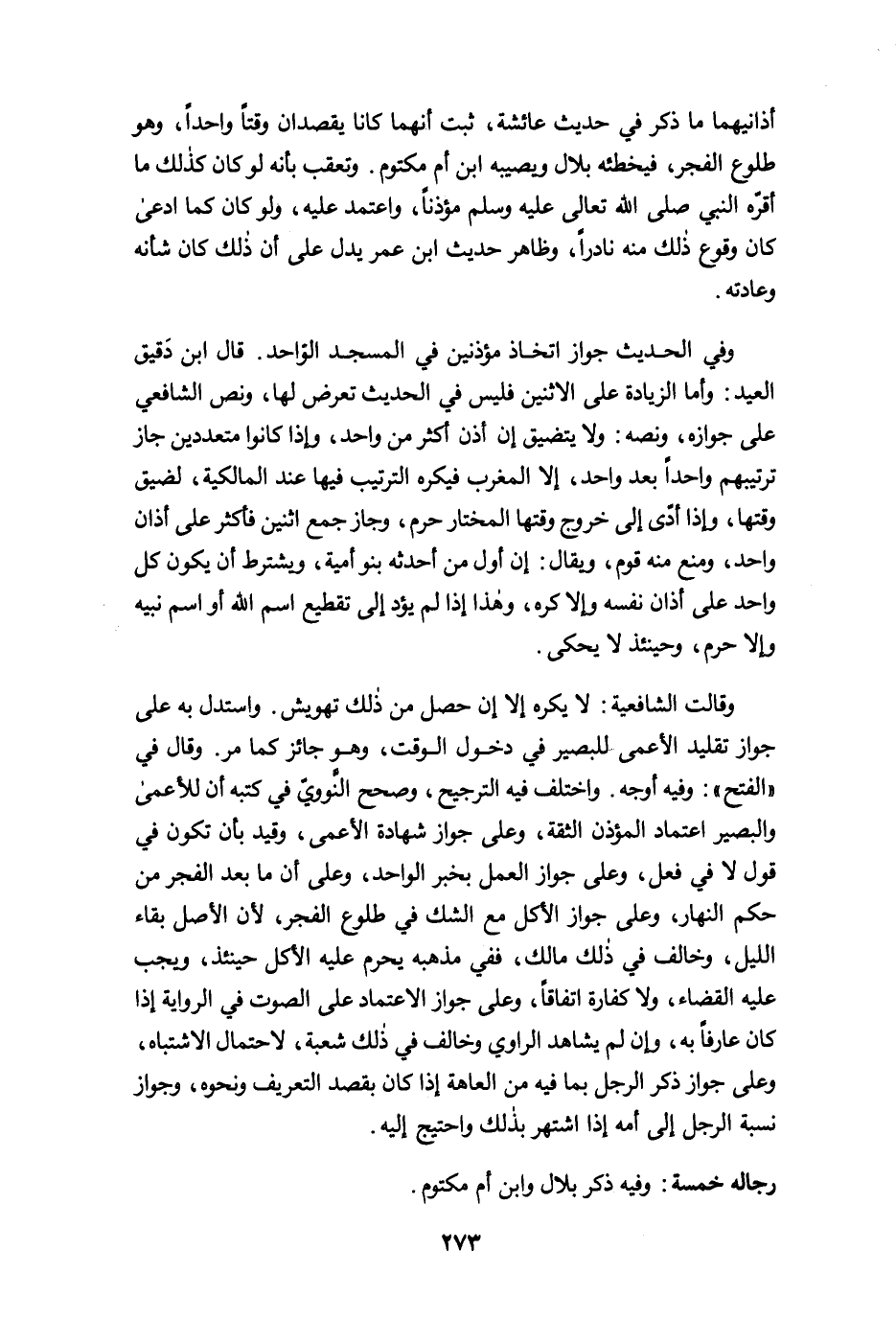وقالت الشافعية: لا يكره إلا إن حصل من ذلك تهويش. واستدل به على جواز تقليد الأعمى للبصير في دخول الوقت، وهو جائز كما مرّ. وقال في "الفتح": وفيه أوجه. واختلف فيه الترجيح، وصحح النووي في كتبه أن للأعمى والبصير اعتماد المؤذن الثقة، وعلى جواز شهادة الأعمى، وقيد بأنّ تكون في قول لا في فعل، وعلى جواز العمل بخبر الواحد، وعلى أن ما بعد الفجر من حكم النهار، وعلى جواز الأكل مع الشك في طلوع الفجر؛ لأن الأصل بقاء الليل، وخالف في ذلك مالك، ففي مذهبه يحرم عليه الأكل حينئذ، ويجب عليه القضاء، ولا كفارة اتفاقًا، وعلى جواز الاعتماد على الصوت في الرواية إذا كان عارفًا به، وإن لم يشاهد الراوي وخالف في ذلك شعبة، لاحتمال الاشتباه، وعلى جواز ذكر الرجل بما فيه من العاهة إذا كان بقصد التعريف ونحوه، وجواز نسبة الرجل إلى أمه إذا اشتهر بذلك واحتيج إليه.