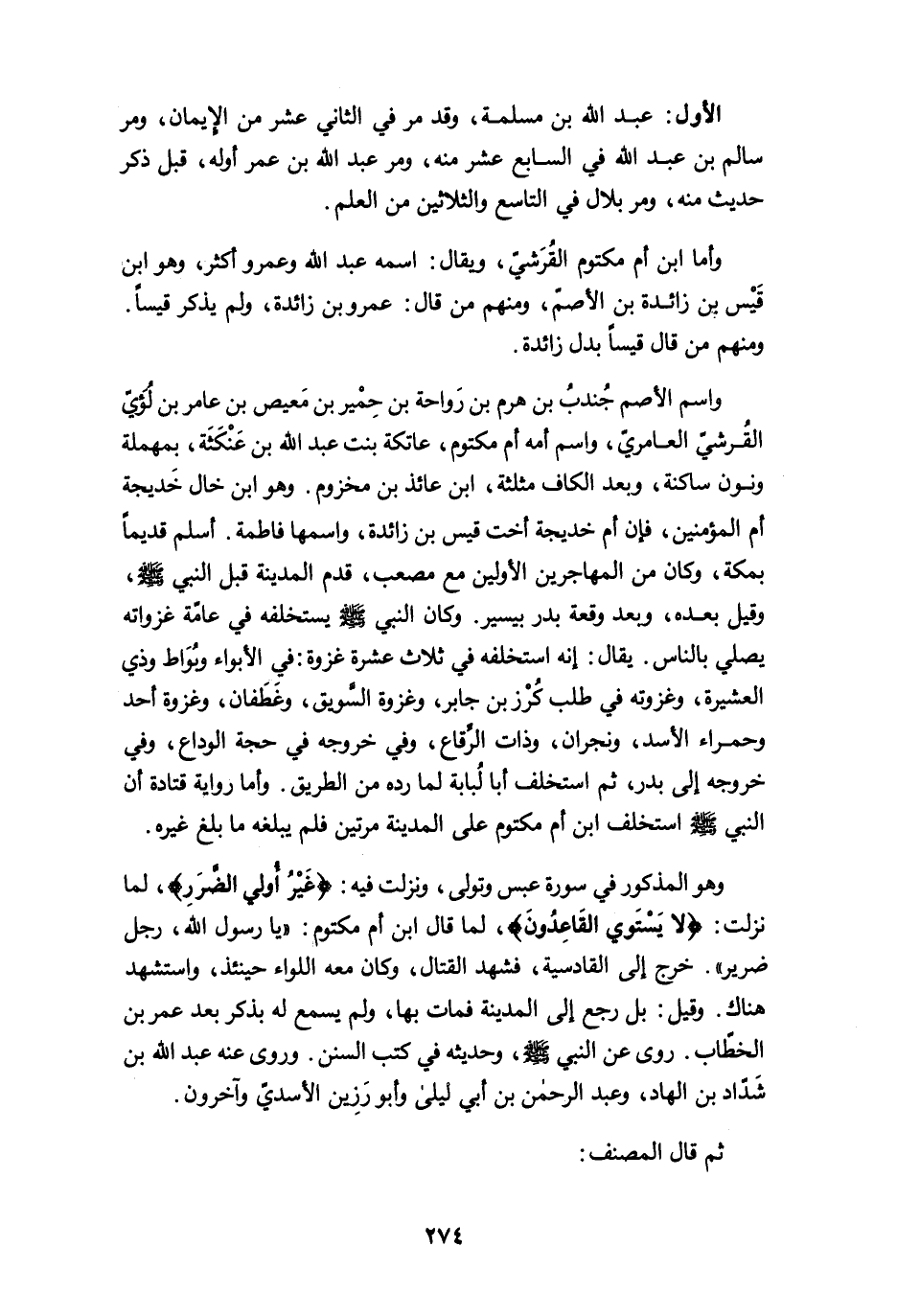 وهو المذكور في سورة عبس وتولى، ونزلت فيه: {غَيْرُ أُولِي الضَّرَرِ}، لما نزلت: {لَا يَسْتَوِي الْقَاعِدُونَ}، لما قال ابن أم مكتوم: "يا رسول الله، رجل ضرير". خرج إلى القادسية، فشهد القتال، وكان معه اللواء حينئذ، واستشهد هناك. وقيل: بل رجع إلى المدينة فمات بها، ولم يسمع له بذكر بعد عمر بن الخطّاب. روى عن النبي -صلى الله عليه وسلم-، وحديثه في كتب السنن. وروى عنه عبد الله بن شَدّاد بن الهاد، وعبد الرحمن بن أبي ليلي وأبو رَزِين الأسديّ وآخرون.