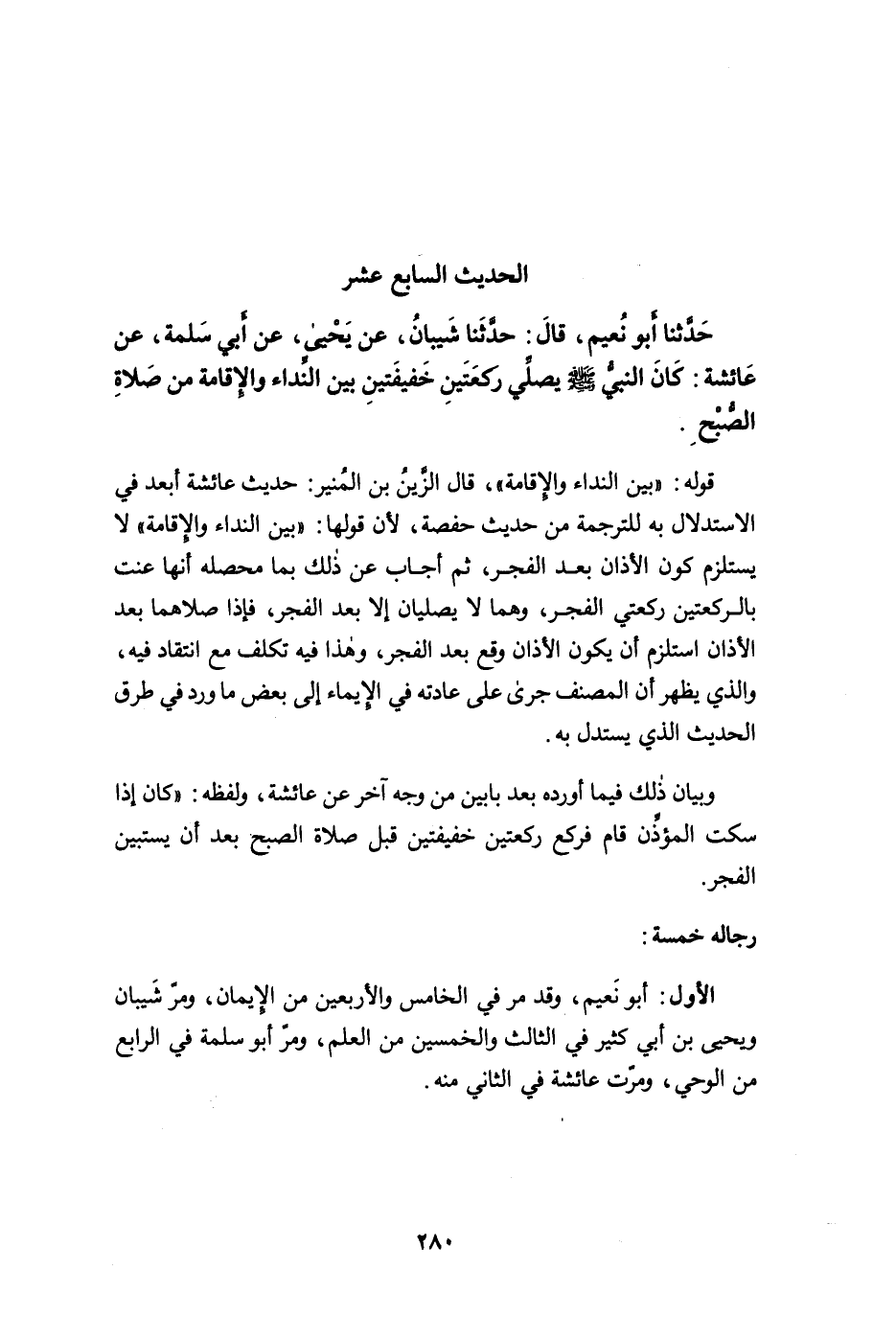 حَدَّثَنَا أَبُو نُعَيْمٍ، قَالَ: حَدَّثَنَا شَيْبَانُ، عَنْ يَحْيَى، عَنْ أَبِي سَلَمَةَ، عَنْ عَائِشَةَ: كَانَ النَّبِيُّ -صلى الله عليه وسلم- يُصَلِّي رَكْعَتَيْنِ خَفِيفَتَيْنِ بَيْنَ النِّدَاءِ وَالإِقَامَةِ مِنْ صَلاَةِ الصُّبْحِ.