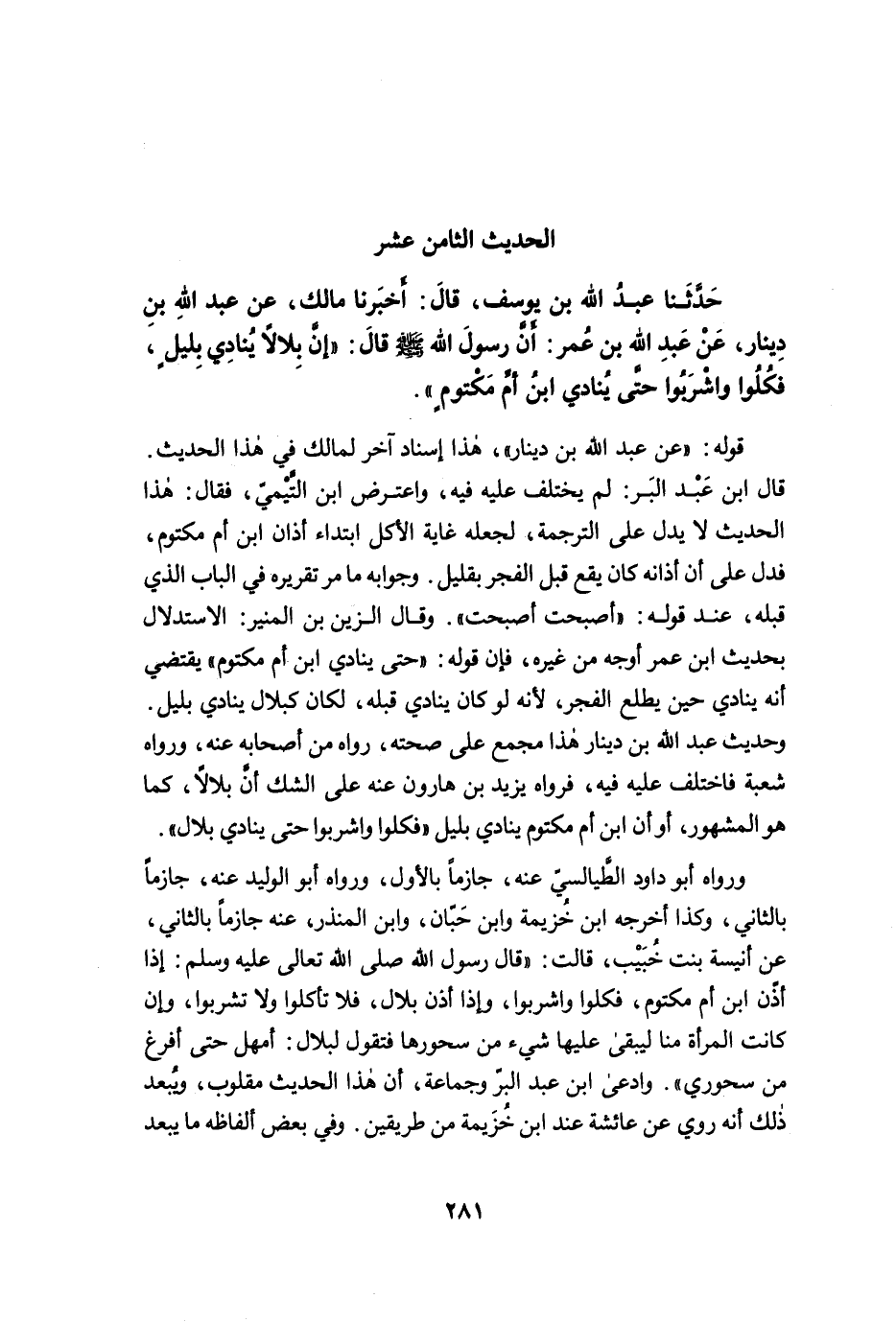 حَدَّثَنَا عَبْدُ اللَّهِ بْنُ يُوسُفَ، قَالَ: أَخْبَرَنَا مَالِكٌ، عَنْ عَبْدِ اللَّهِ بْنِ دِينَارٍ، عَنْ عَبْدِ اللَّهِ بْنِ عُمَرَ: أَنَّ رَسُولَ اللَّهِ -صلى الله عليه وسلم- قَالَ: "إِنَّ بِلاَلاً يُنَادِي بِلَيْلٍ، فَكُلُوا وَاشْرَبُوا حَتَّى يُنَادِيَ ابْنُ أُمِّ مَكْتُومٍ".