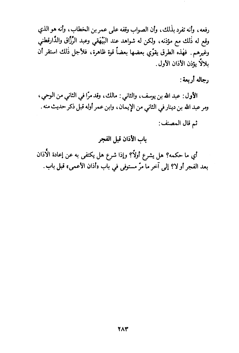 رفعه، وأنه تفرد بذلك، وأن الصواب وقفه على عمر بن الخطاب، وأنه هو الذي وقع له ذلك مع مؤذنه، ولكن له شواهد عند البَيْهَقي وعبد الرَّزَّاق والدَّارقطني وغيرهم. فهذه الطرق يقوّي بعضها بعضًا قوة ظاهرة، فلأجل ذلك استقر أن بلالًا يؤذن الأذان الأول.