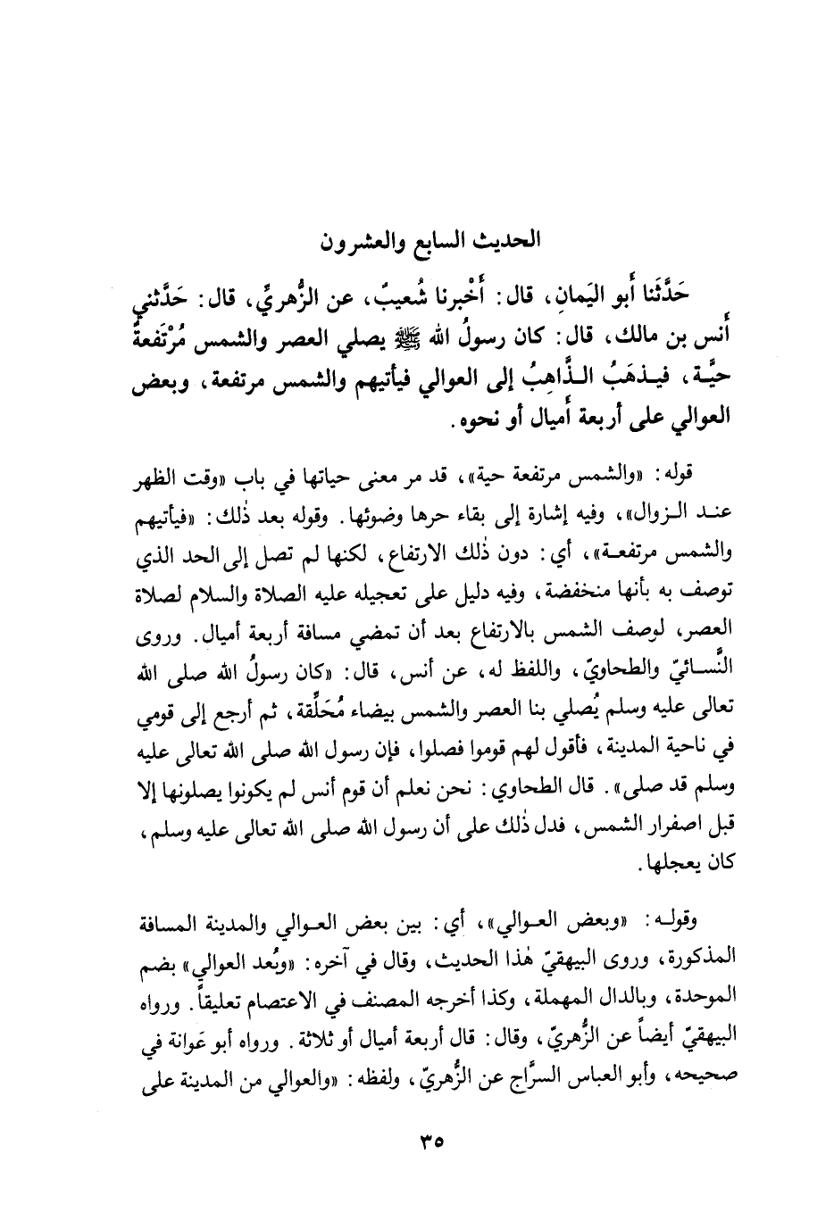 حَدَّثَنَا أَبُو الْيَمَانِ، قَالَ: أَخْبَرَنَا شُعَيْبٌ، عَنِ الزُّهْرِيِّ، قَالَ: حَدَّثَنِي أَنَسُ بْنُ مَالِكٍ، قَالَ كَانَ رَسُولُ اللَّهِ -صلى الله عليه وسلم- يُصَلِّي الْعَصْرَ وَالشَّمْسُ مُرْتَفِعَةٌ حَيَّةٌ، فَيَذْهَبُ الذَّاهِبُ إِلَى الْعَوَالِي فَيَأْتِيهِمْ وَالشَّمْسُ مُرْتَفِعَةٌ، وَبَعْضُ الْعَوَالِي عَلَى أَرْبَعَةِ أَمْيَالٍ أَوْ نَحْوِهِ.