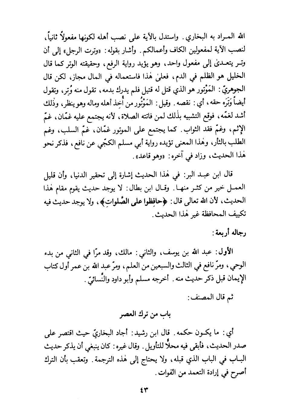 الله المراد به البخاري. واستدل بالآية على نصب أهله لكونها مفعولًا ثانيًا، لنصب الآية لمفعولين الكاف وأعمالكم. وأشار بقوله: "وترت الرجل" إلى أن وتر يتعدى إلى مفعول واحد، وهو يؤيد رواية الرفع، وحقيقته الوتر كما قال الخليل هو الظلم في الدم، فعلى هذا فاستعماله في المال مجاز، لكن قال الجوهريّ: المَوْتور هو الذي قتل له قتيل فلم يدرك بدمه، تقول منه وُتِر، وتقول أيضًا وَتَرَه حقه، أي: نقصه. وقيل: المَوْتُور من أُخِذ أهله وماله وهو ينظر، وذلك أشد لغمّه، فوقع التشبيه بذلك لمن فاتته الصلاة، لأنه يجتمع عليه غمّان، غمّ الإثم، وغمّ فقد الثواب. كما يجتمع على الموتور غمّان، غمّ السلب، وغم الطلب بالثأر، وهذا المعنى تؤيده رواية أبي مسلم الكجّي عن نافع، فذكر نحو هذا الحديث، وزاد في آخره: "وهو قاعد".