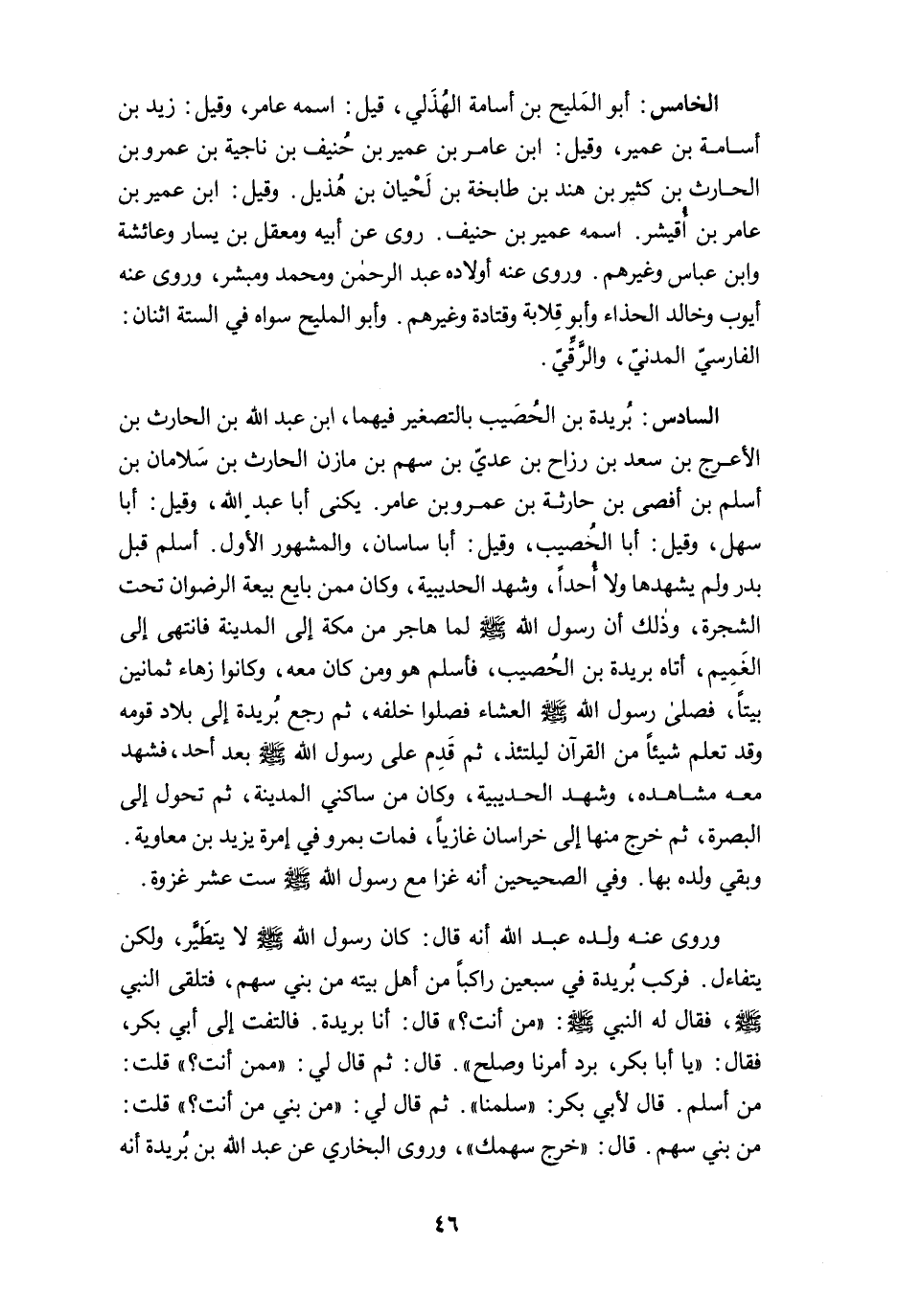 السادس: بُريدة بن الحُصَيب بالتصغير فيهما، ابن عبد الله بن الحارث بن الأعرج بن سعد بن رزاح بن عديّ بن سهم بن مازن الحارث بن سَلامان بن أسلم بن أفصى بن حارثة بن عمرو بن عامر. يكنى أبا عبد الله، وقيل: أبا سهل، وقيل: أبا الخُصيب، وقيل: أبا ساسان، والمشهور الأول. أسلم قبل بدر ولم يشهدها ولا أُحدًا، وشهد الحديبية، وكان ممن بايع بيعة الرضوان تحت الشجرة، وذلك أن رسول الله -صلى الله عليه وسلم- لما هاجر من مكة إلى المدينة فانتهى إلى الغَمِيم، أتاه بريدة بن الحُصيب، فأسلم هو ومن كان معه، وكانوا زهاء ثمانين بيتًا، فصلى رسول الله -صلى الله عليه وسلم- العشاء فصلوا خلفه، ثم رجع بُريدة إلى بلاد قومه وقد تعلم شيئًا من القرآن ليلتئذ، ثم قَدِم على رسول الله -صلى الله عليه وسلم- بعد أحد، فشهد معه مشاهده، وشهد الحديبية، وكان من ساكني المدينة، ثم تحول إلى البصرة، ثم خرج منها إلى خراسان غازيًا، فمات بمرو في إمرة يزيد بن معاوية. وبقي ولده بها. وفي الصحيحين أنه غزا مع رسول الله -صلى الله عليه وسلم- ست عشر غزوة.